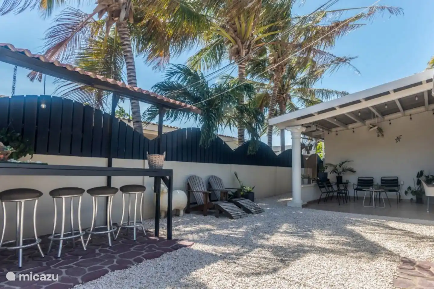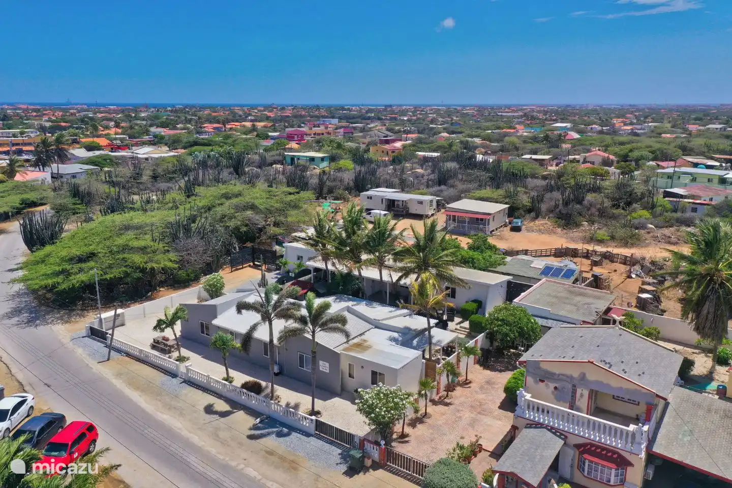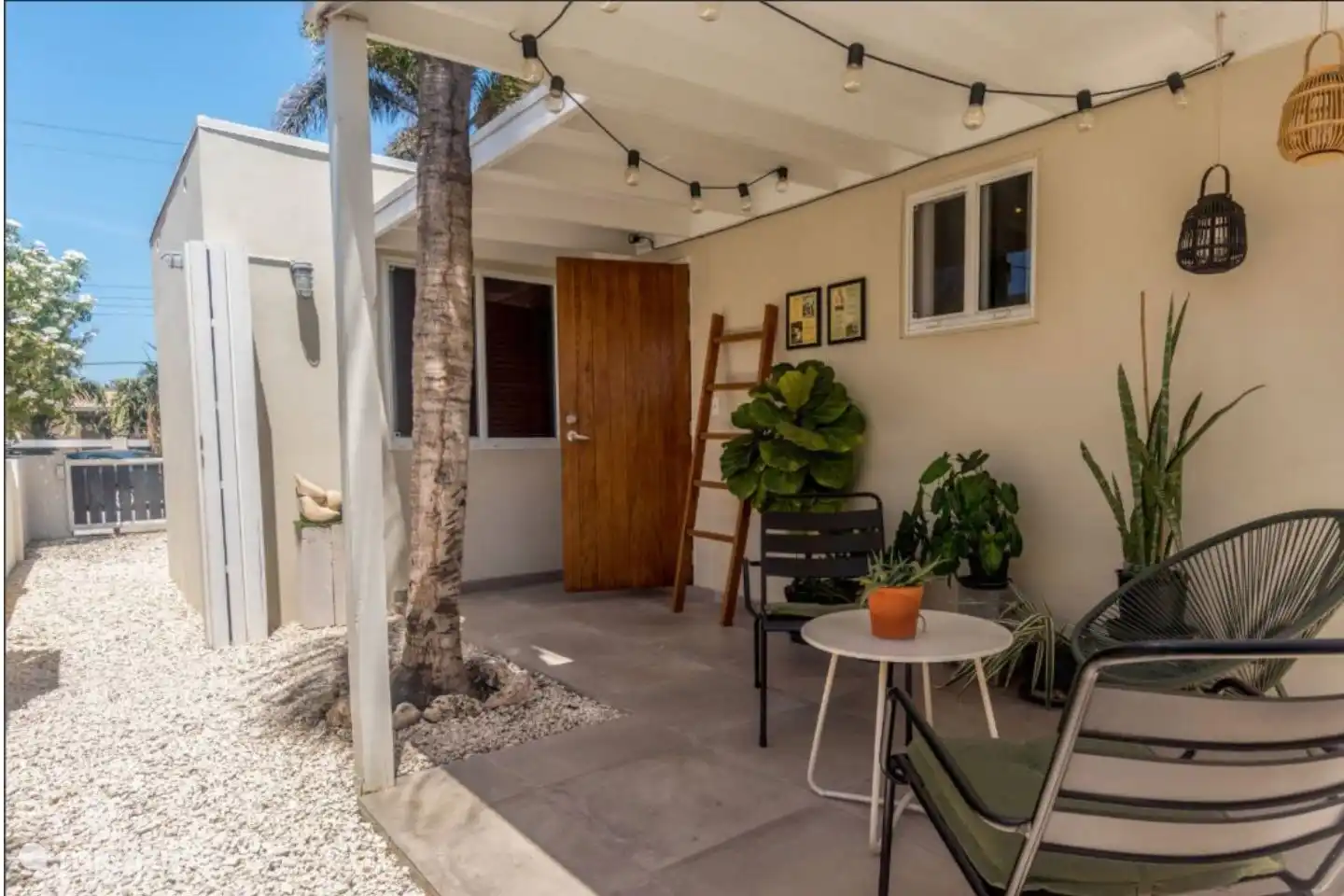 Une propriété prête à emménager à Aruba avec une maison et 3 appartements de vacances élégamment meublés dans un jardin de sculptures relaxant avec des palmiers ondulants, beaucoup de plantes vertes et une belle piscine longue.