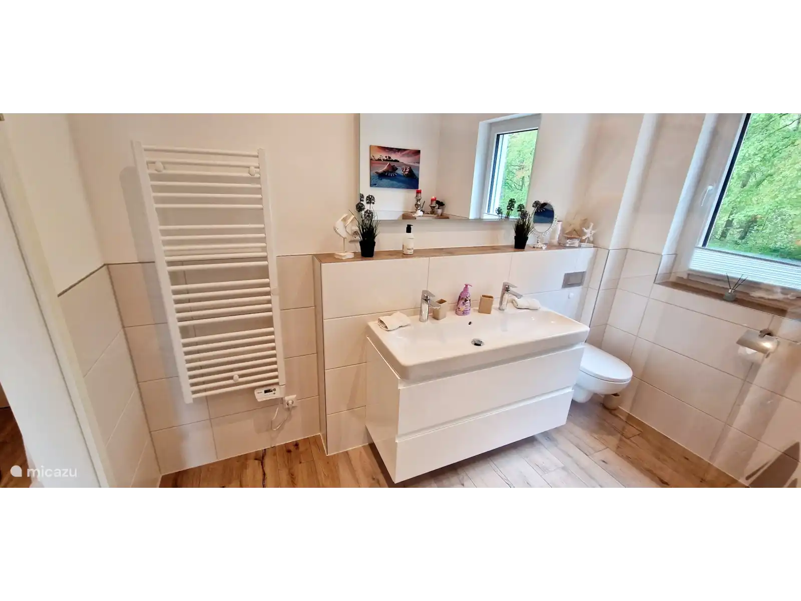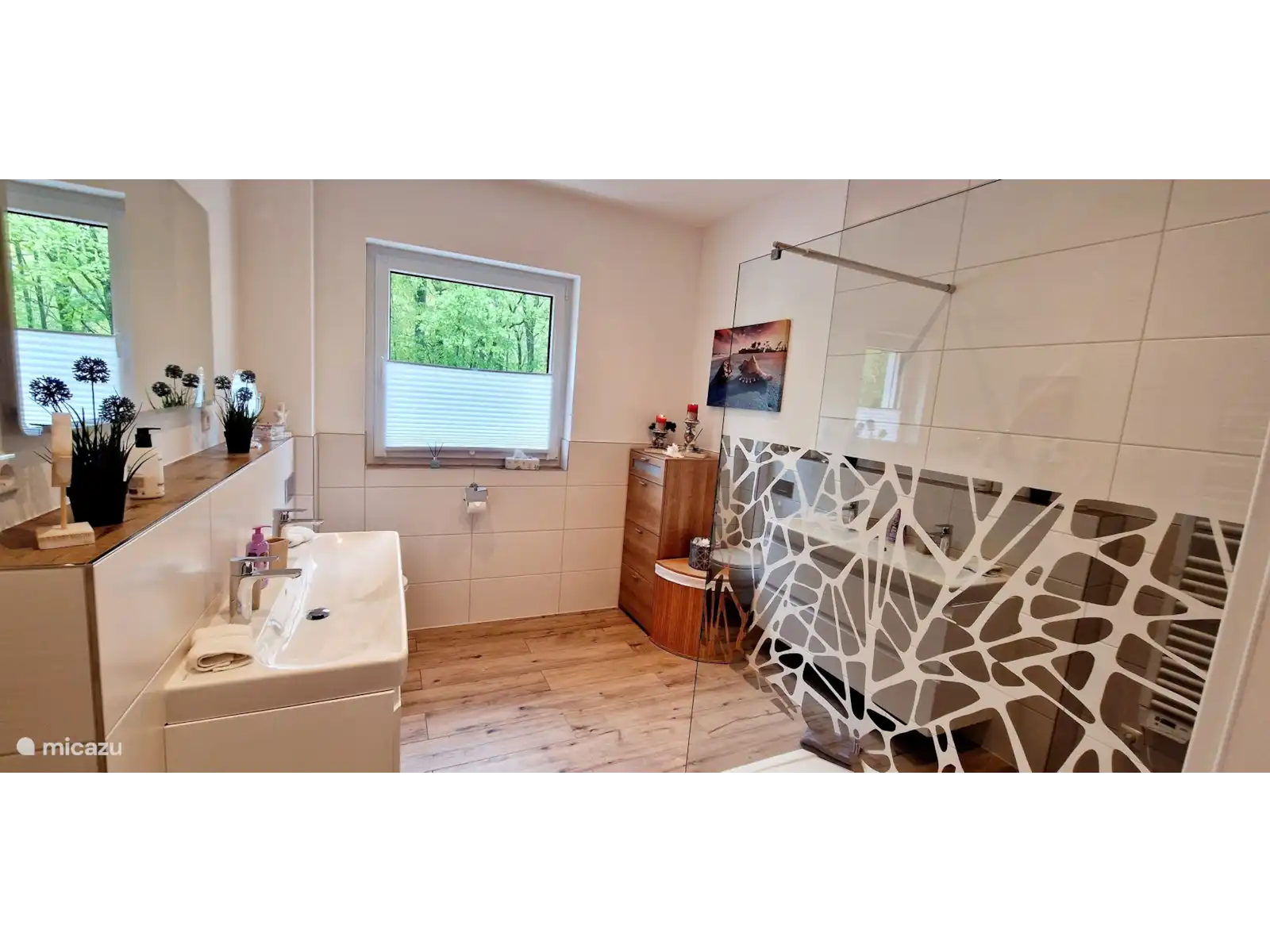 1 salle de bain avec WC, double vasque et douche à l’italienne avec
