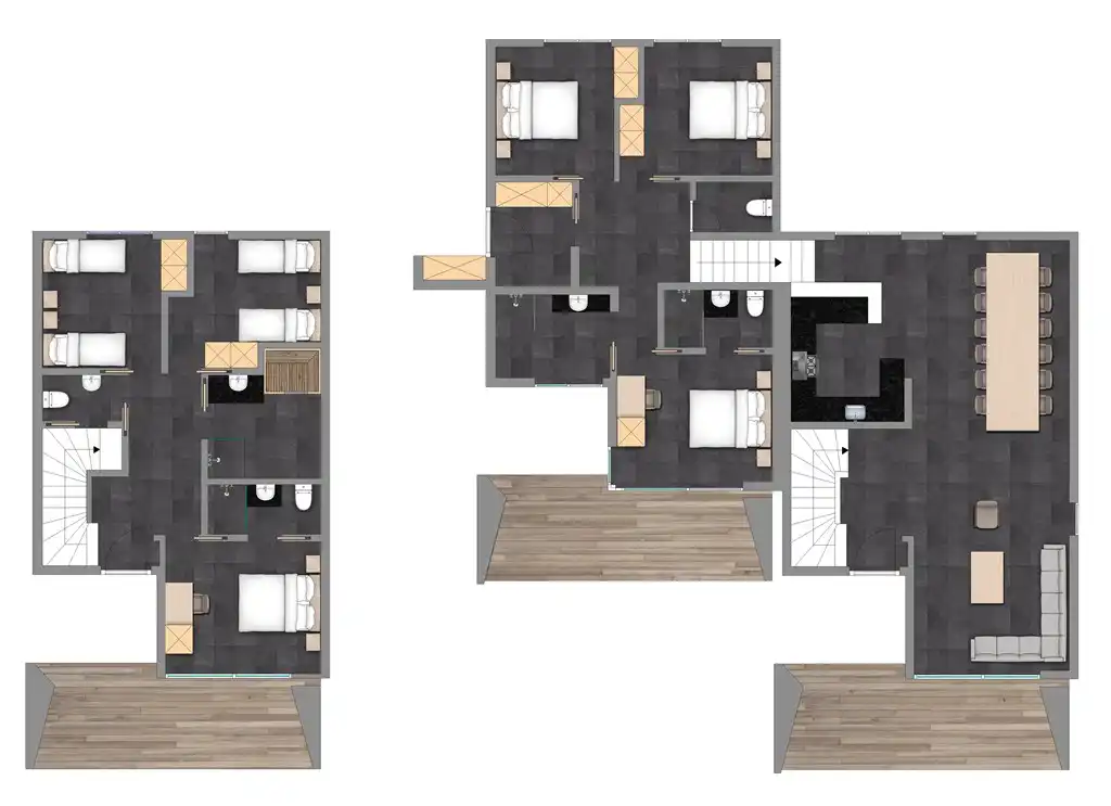 Au 1er étage se trouve la spacieuse pièce à vivre avec un coin salon, une luxueuse cuisine ouverte entièrement équipée et un confortable coin salon et salle à manger. Une télévision à écran plat et un beau foyer au gaz complètent le beau salon décoré avec goût. Les grandes baies vitrées vous offrent une vue panoramique sur la piste de ski. Cet étage a une connexion directe avec le dernier étage du bâtiment jumelé. Il y a encore 3 chambres et 2 salles de bains. Cela rend cette maison avec un total de 6 chambres et un canapé-lit dans le salon pour 12 à 14 personnes.Les chambres ont deux lits simples et un canapé-lit double dans le salon. Toute la villa dispose du chauffage au sol. Il est également possible de louer l'appartement du dessous, afin de pouvoir profiter de cette villa unique pouvant accueillir jusqu'à 20 personnes !