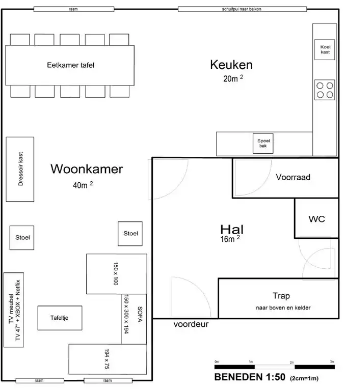 - au rez-de-chaussée se trouvent le salon, la salle à manger/cuisine et les toilettes