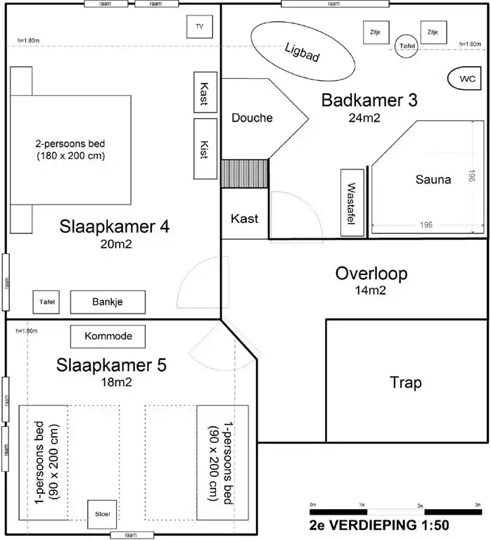 - au dernier étage il y a 2 chambres plus spacieuses. Il y a également un vaste espace bien-être de luxe avec un sauna pour 4 personnes, une baignoire îlot, une douche séparée, des toilettes et un double lavabo. La construction haute du toit confère aux pièces un aspect très particulier.