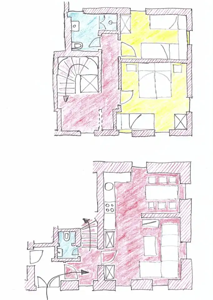 Le salon est meublé avec style et se compose d’un coin repas, d’un salon et de la cuisine. La salle à manger est séparée de l’espace de vie par un mur de grès. La salle à manger dispose d’une table à manger en bois avec cinq chaises. Le salon peut accueillir cinq personnes, où vous pourrez également profiter d’un lecteur Blu-ray et d’une télévision Full HD. De plus, la télévision est équipée d’un récepteur satellite. Il y a aussi des toilettes au rez-de-chaussée sous les escaliers.