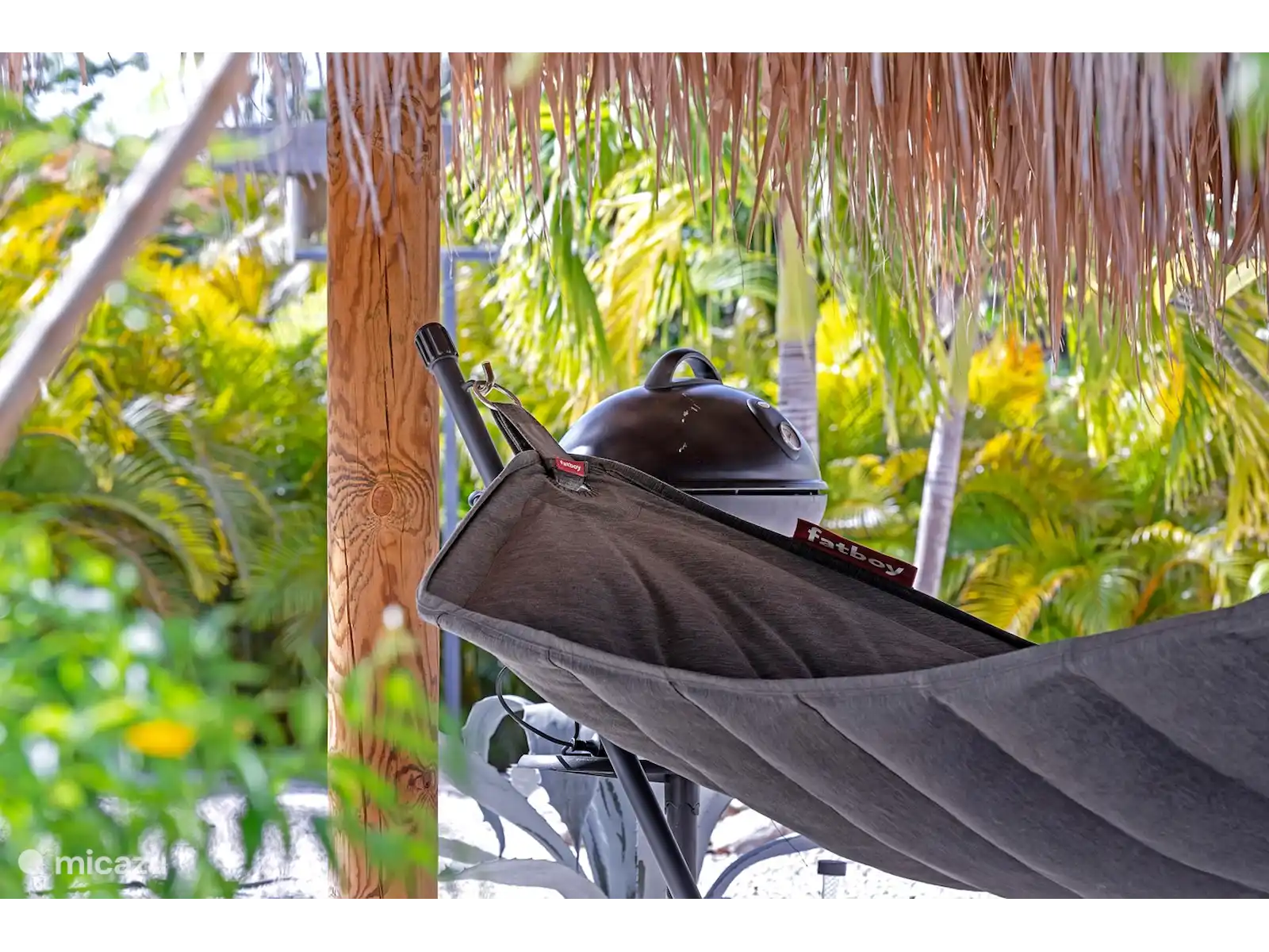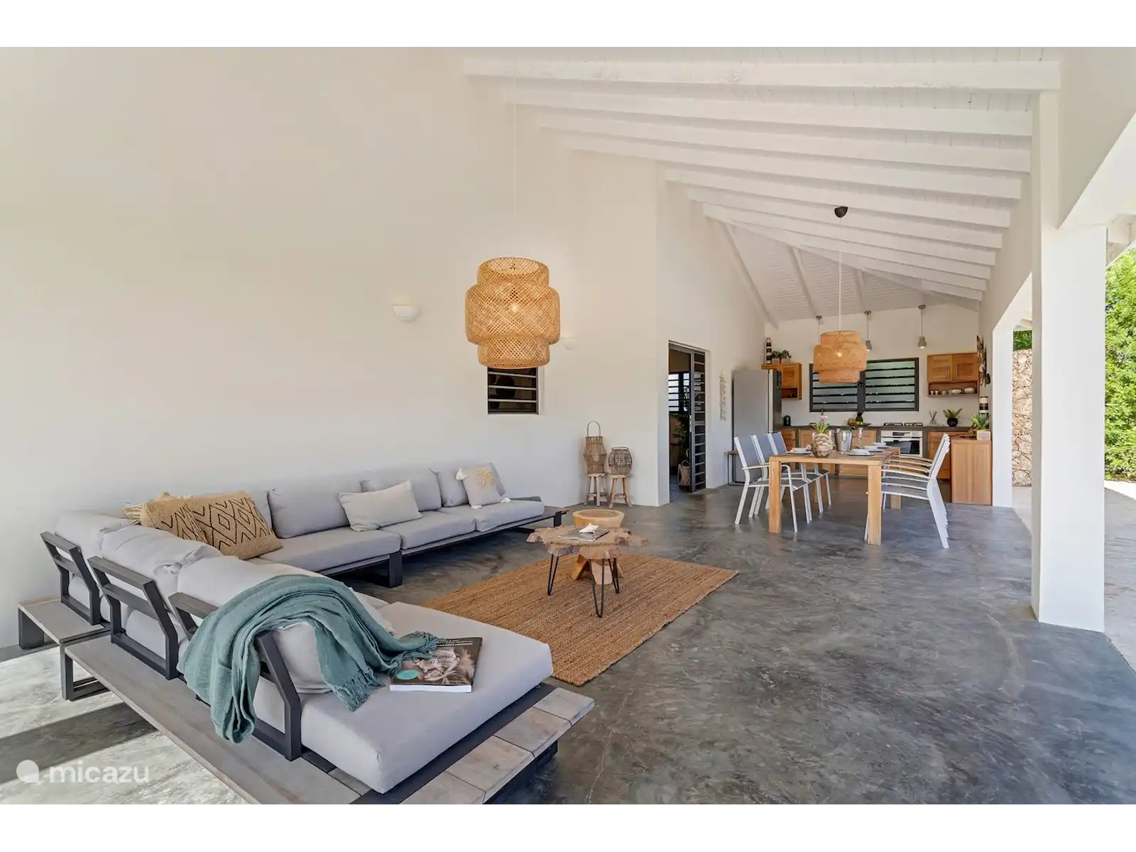 Il y a un porche spacieux avec coin repas, un salon et une cuisine extérieure.