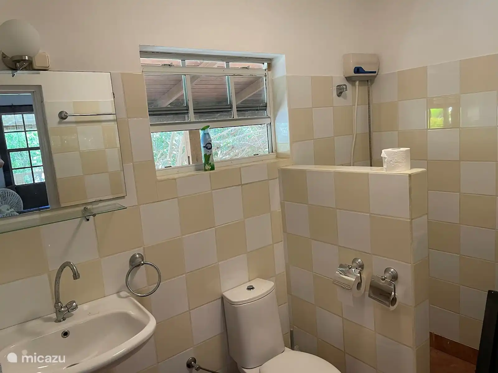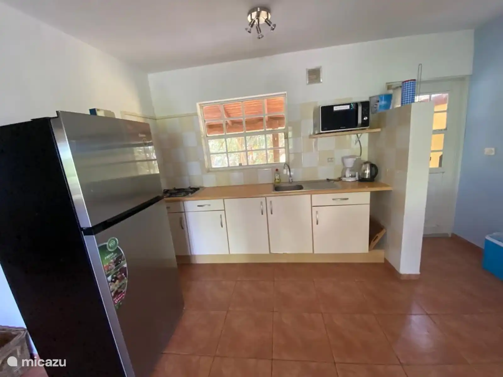 La cuisine est entièrement équipée et comprend un grand réfrigérateur avec congélateur, cafetière, grille-pain, mixeur et micro-ondes combinés. La salle de bain a une douche, des toilettes et un lavabo. Il y a deux chambres, avec leur propre climatisation et ventilateur de plafond, une chambre avec un lit double et une chambre avec 2 lits simples. Derrière la maison se trouve la machine à laver. Sur le toit-terrasse se trouvent des transats et une table avec des chaises. Il y a aussi des chaises longues que vous pouvez utiliser sur la terrasse sur le toit. La terrasse sur le toit (80m2) est accessible par un escalier fixe (extérieur). Vous pouvez également vous asseoir dans le jardin, avec des plantes tropicales et des palmiers. Vous pouvez garer votre voiture dans l'allée devant le jardin. Si vous le souhaitez, nous pouvons vous mettre en contact pour une location de voiture (à un prix raisonnable).