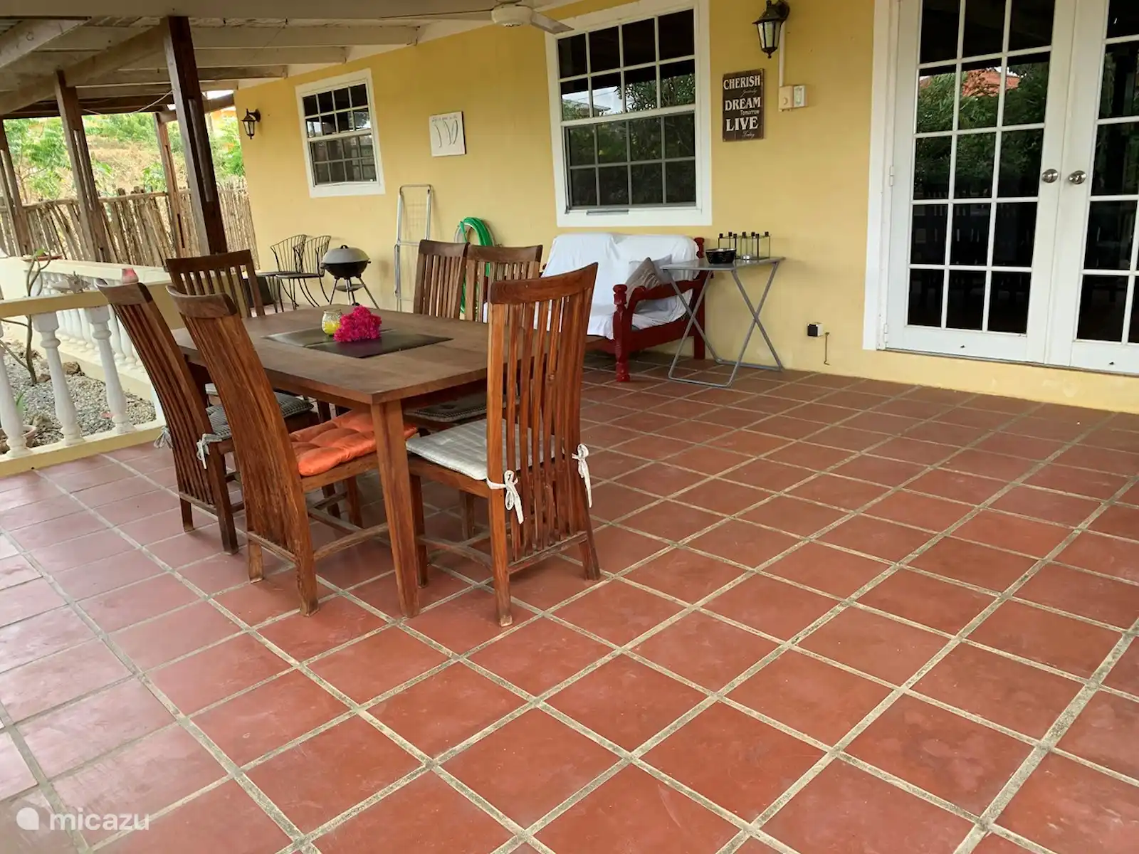 Cette confortable maison de vacances est située dans un jardin tropical dans le quartier de Nawati. La maison est idéale pour les vacances, mais aussi si vous venez vivre temporairement à Bonaire. POUR LA PÉRIODE du 22 septembre au 30 octobre 15% de RÉDUCTION sur le prix de la location. Vous entrez dans le porche par le jardin tropical, où se trouvent une salle à manger confortable et un canapé, puis vous entrez dans le salon avec cuisine ouverte. Le salon est meublé d'un coin repas et d'un coin salon avec une grande télévision. Il y a un ventilateur de plafond et la climatisation.