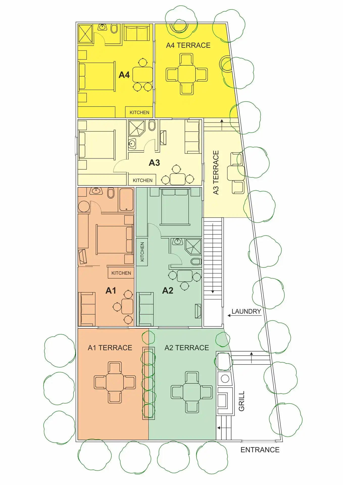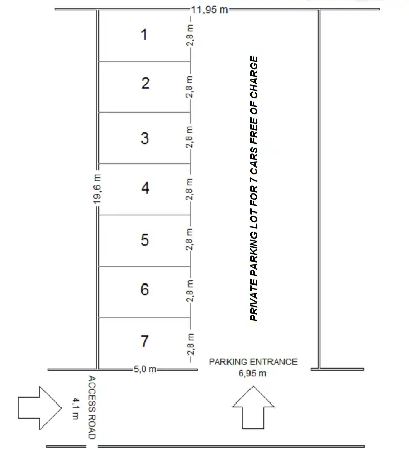 Chaque appartement dispose de sa propre place de parking devant la maison, d’une entrée séparée, d’une terrasse ombragée avec des meubles, d’une chambre avec un lit double, d’une cuisine avec coin repas et salon dans une pièce plus grande, ainsi que d’une salle de bains avec douche.