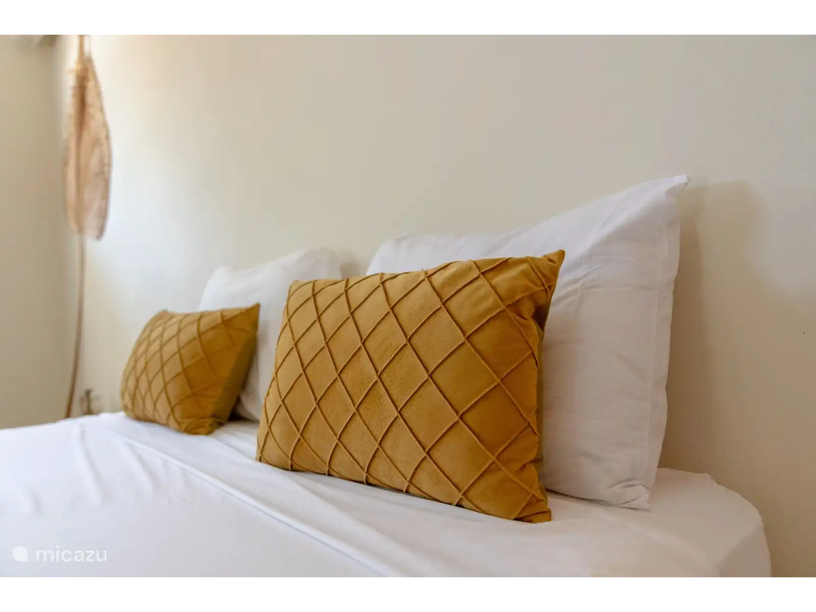 La chambre à coucher : Un lit queen-size confortable avec des oreillers moelleux et des détails naturels, idéal pour une bonne nuit de sommeil.