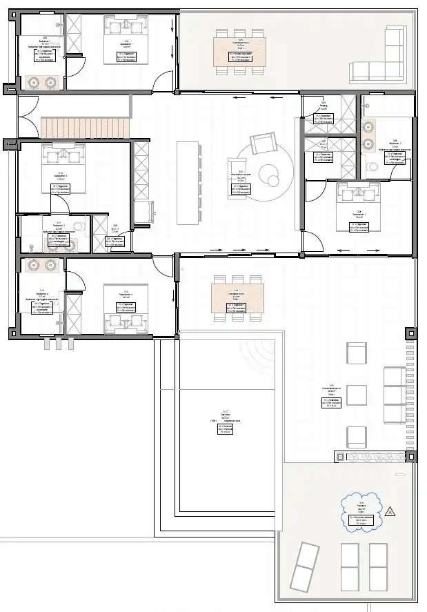 Au rez-de-chaussée vous trouverez la chambre principale et les 3 autres chambres. Toutes les chambres disposent de la climatisation et d'une salle de bains privative avec des sanitaires design de haute qualité européenne.