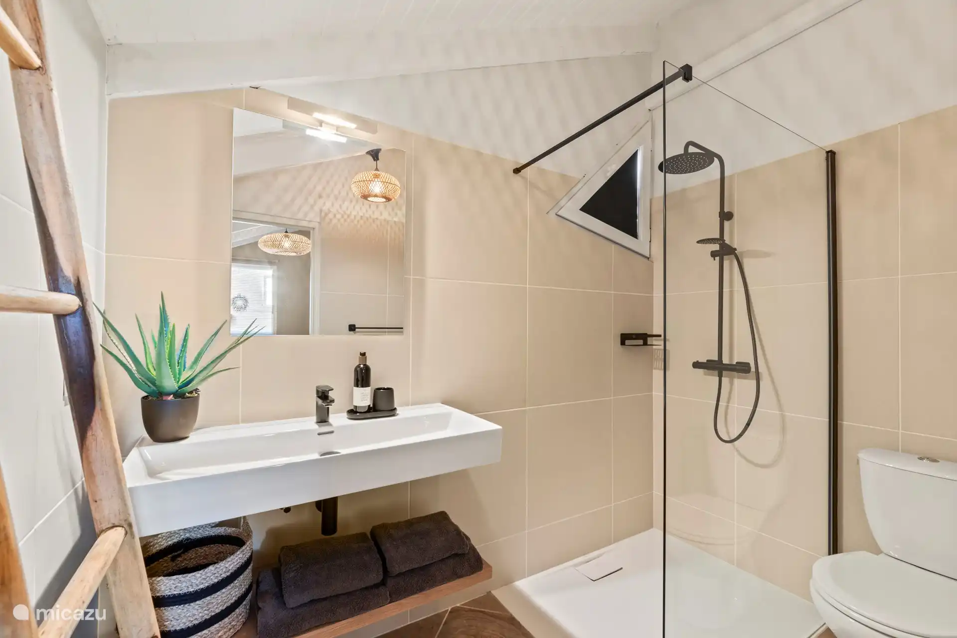 Au rez-de-chaussée, il y a 2 chambres avec 2 salles de bains. Voici aussi la machine à laver.
