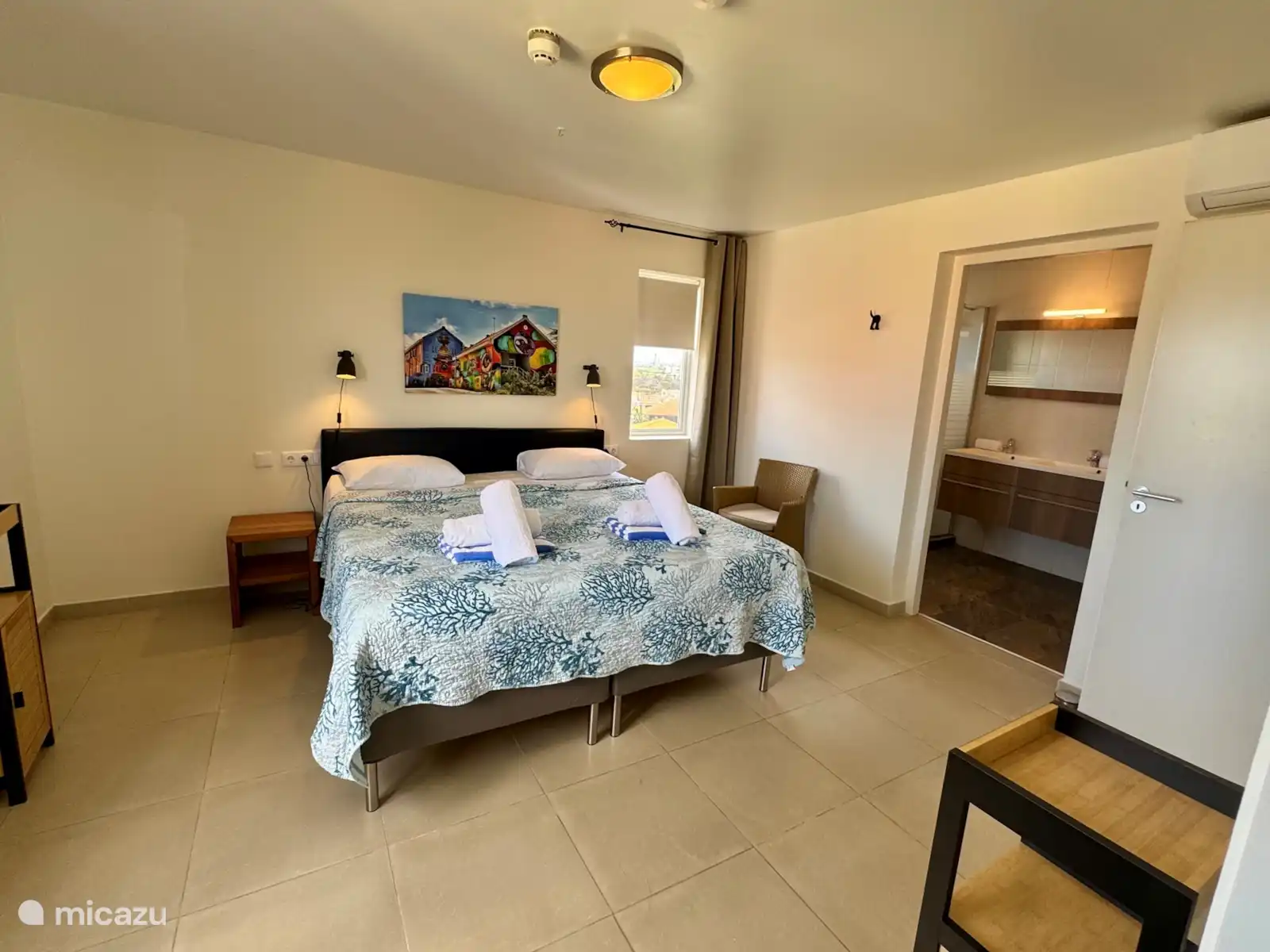 - 2 chambres avec climatisation, salle de bain privée complète (toilettes, lavabos, douche à l’italienne) et beaucoup d’espace dans le placard. La chambre 1 a un grand walk-in.