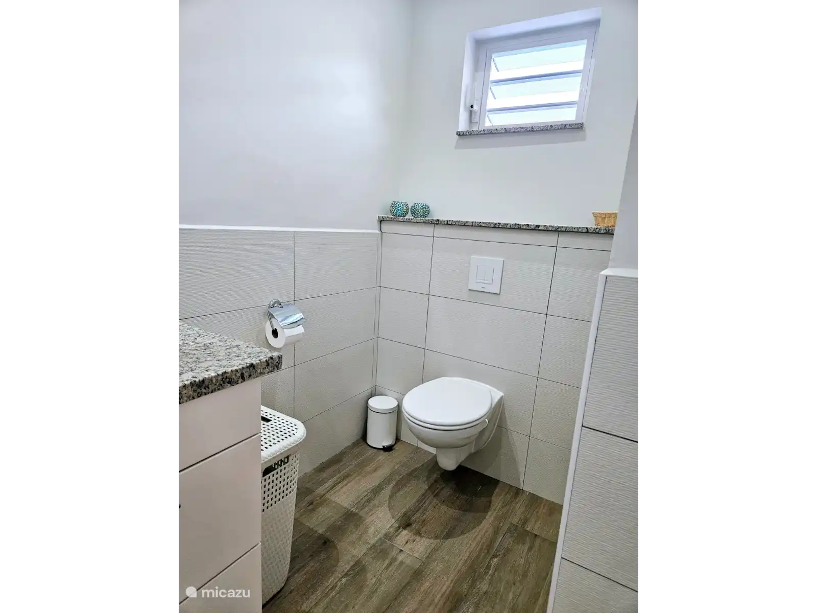 La cuisine avec plateau en pierre naturelle contient un lave-vaisselle, un four / micro-ondes, une plaque à induction, une machine Nespresso, une bouilloire et un grand réfrigérateur / congélateur américain. Il y a aussi une combinaison lave-linge-sèche-linge dans l’appartement.