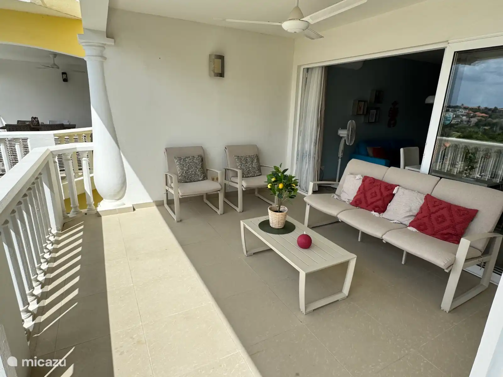La terrasse spacieuse au 3ème étage est accessible depuis la chambre ou le salon et offre de belles vues sur l'île et la mer. Il dispose d'un ventilateur de plafond, d'une causeuse rembourrée confortable et de deux chaises ainsi que d'une table basse/d'appoint.