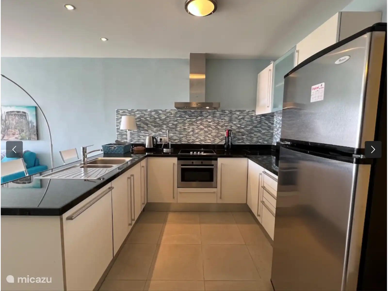 La cuisine ouverte en U est spacieuse et entièrement équipée avec plaques électriques, four, micro-ondes, réfrigérateur, lave-vaisselle tout neuf (février 2020), cafetière, mixeur, bouilloire et ustensiles/couverts de cuisine.