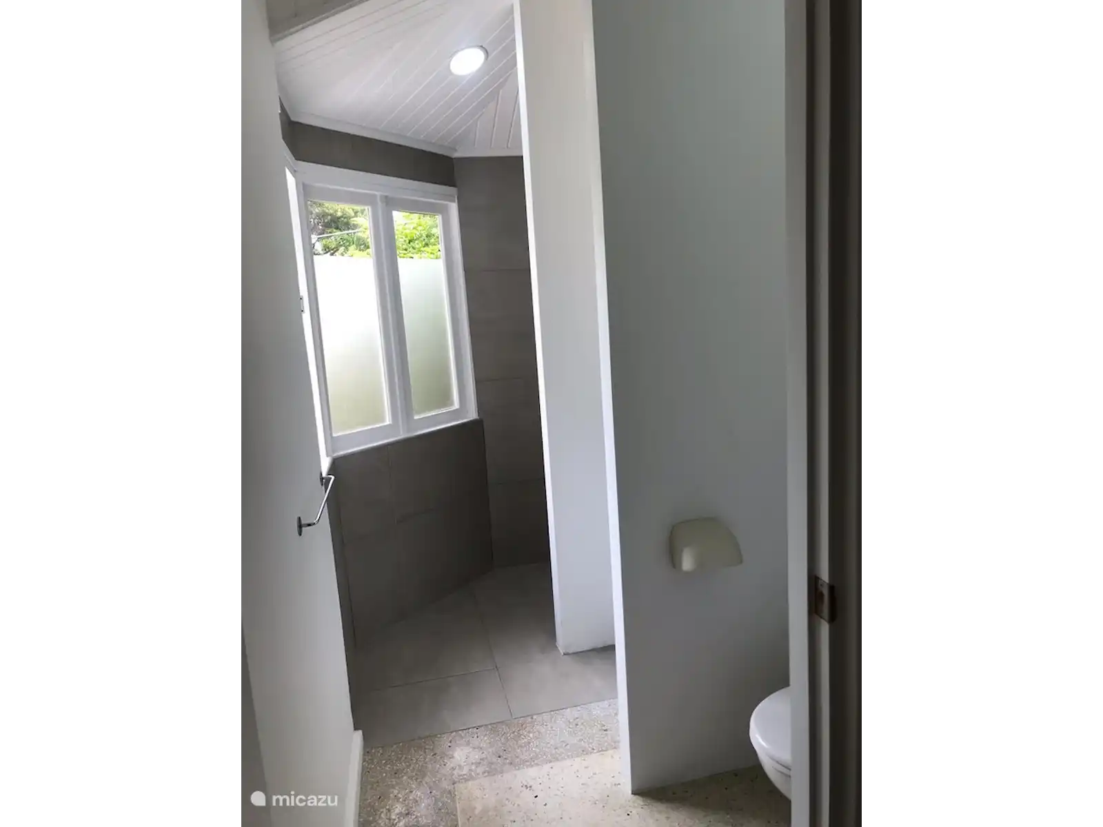 La salle de bain dispose d’une salle de douche spacieuse avec eau chaude, lavabo et toilettes. Les serviettes sont fournies.