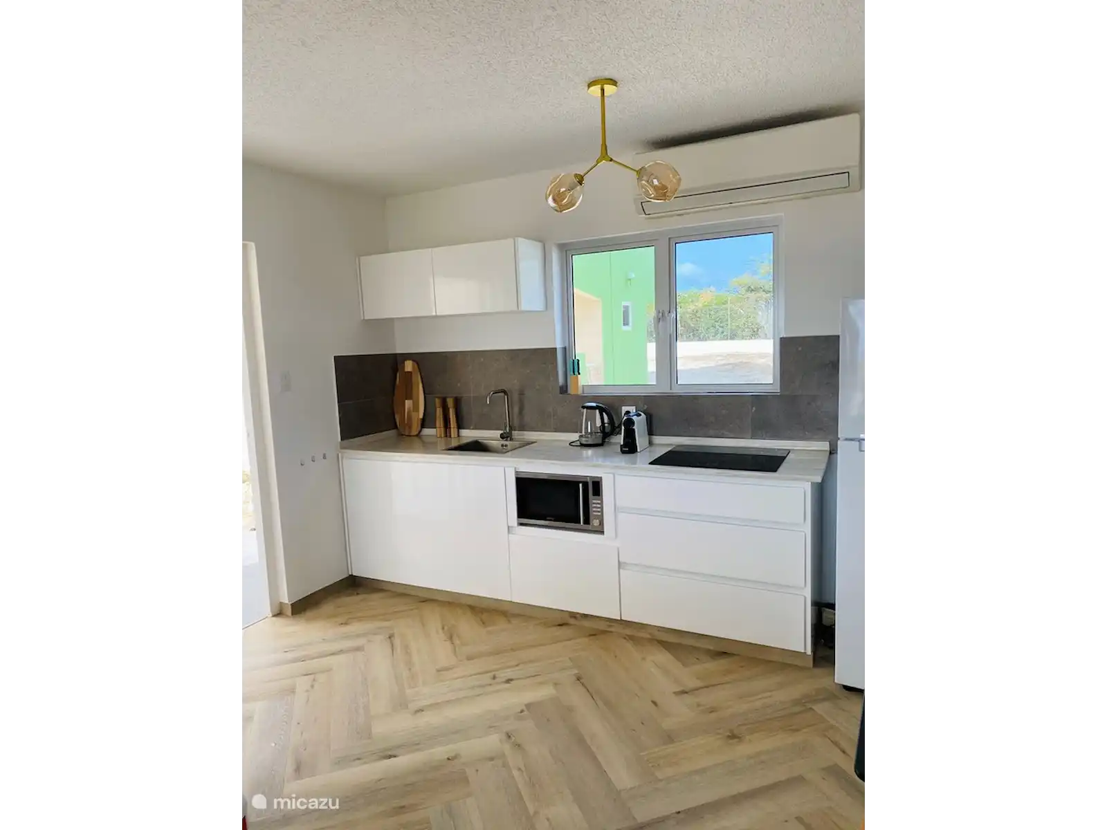 Au rez-de-chaussée se trouve un séjour avec cuisine, équipée d'une plaque électrique, d'un micro-onde combiné et d'une machine Nespresso. Il y a aussi un climatiseur dans cette pièce. Il y a aussi des toilettes au rez-de-chaussée.