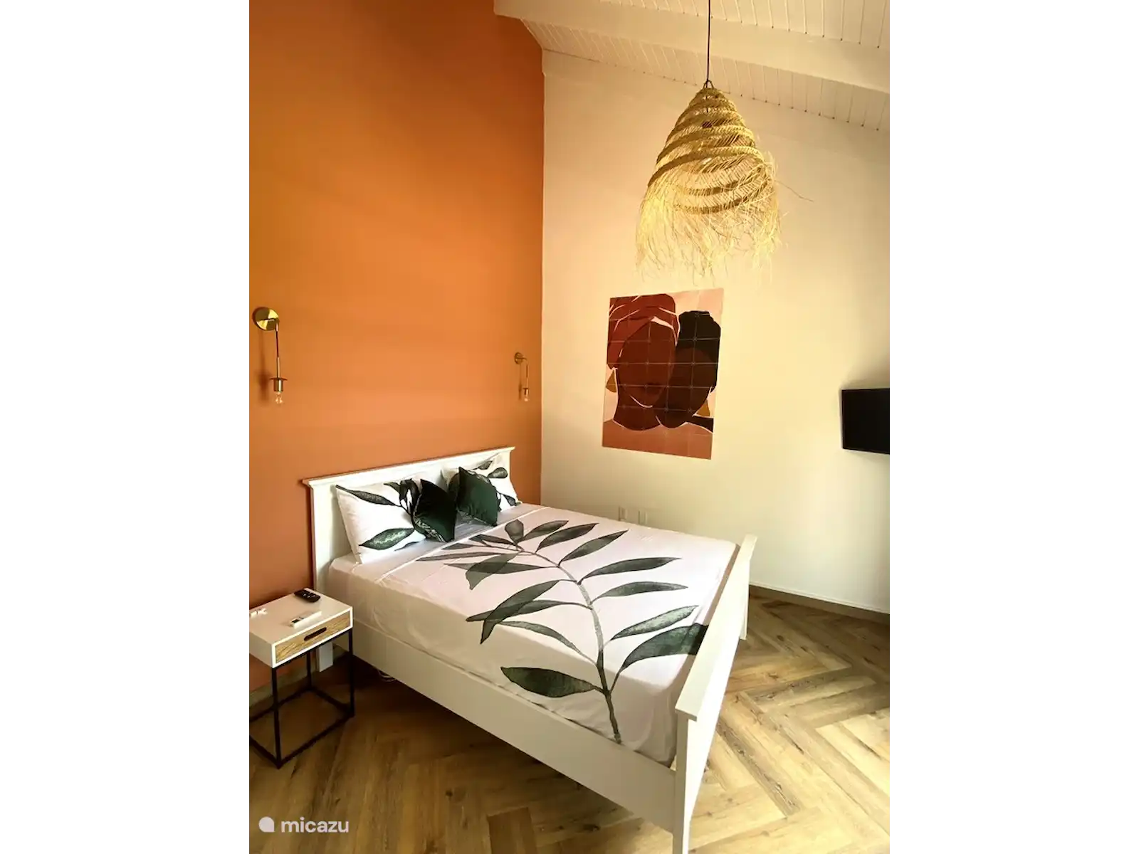 À l'étage supérieur, il y a deux chambres, toutes deux avec un lit queen size avec matelas orthopédique. La chambre principale dispose d'une télévision avec Netflix et d'une porte coulissante avec balcon français, qui offre une vue sur l'océan.