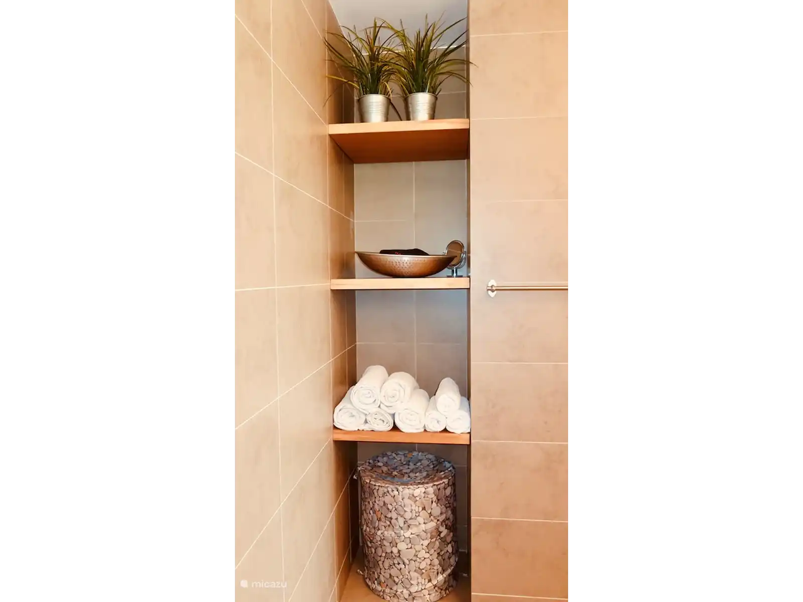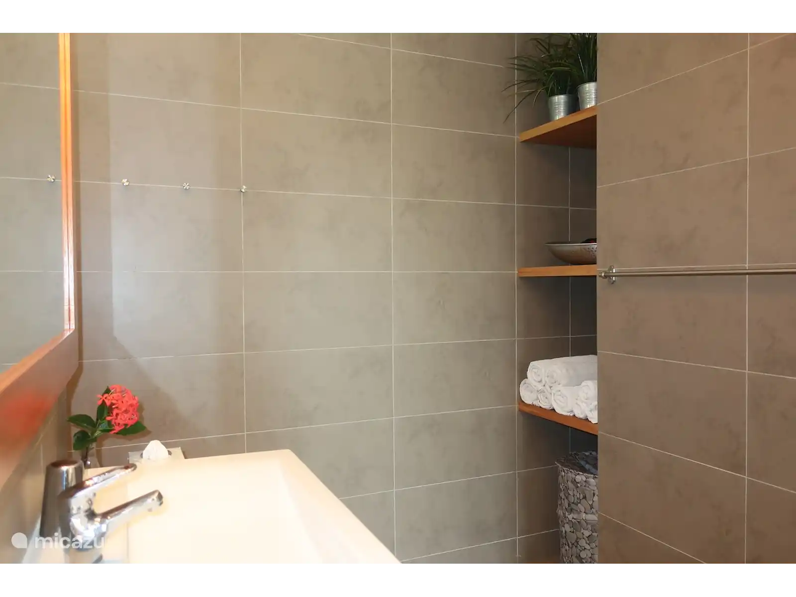 Le salon (8x8) dispose d’un coin salon douillet, de ventilateurs de plafond pour un refroidissement supplémentaire et d’une smart TV avec connexion fibre optique, ce qui vous permet d’accéder à des centaines de chaînes TV, toutes néerlandaises et la plupart des chaînes européennes ainsi que des chaînes sportives et médias américaines.