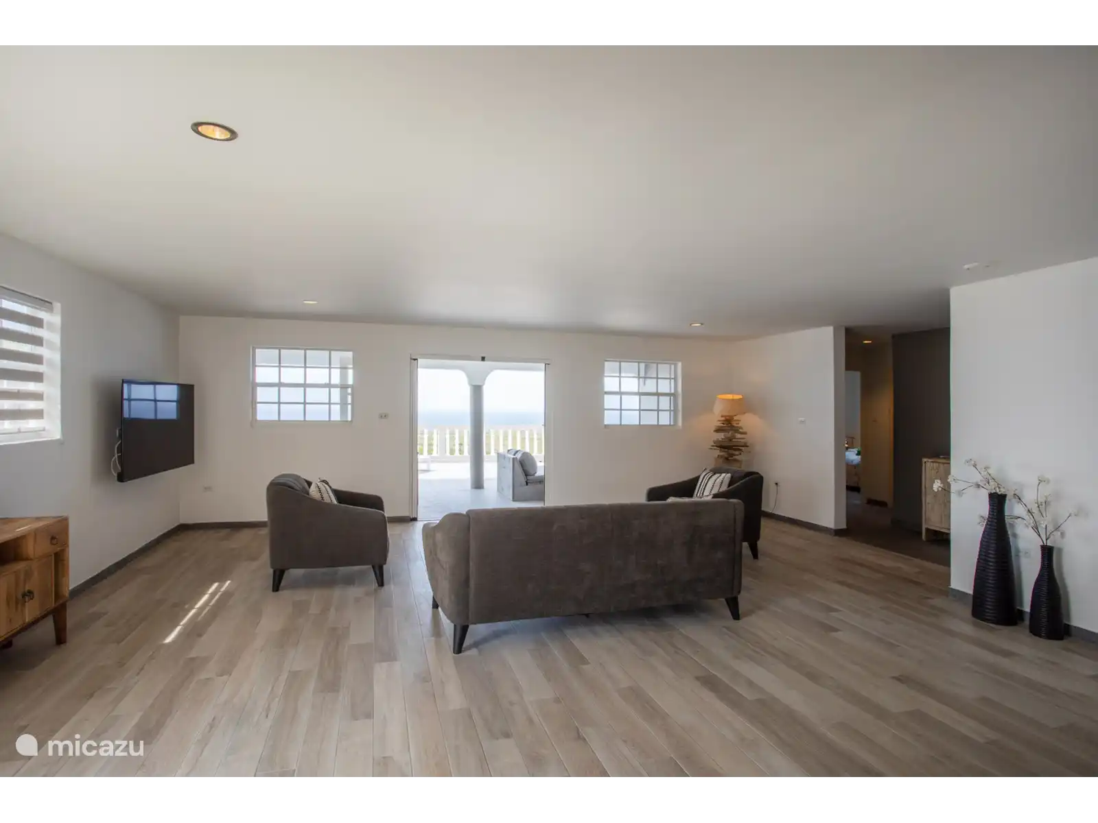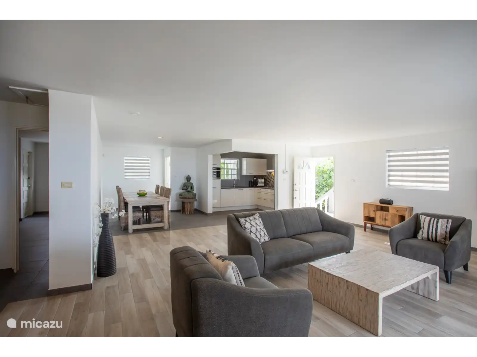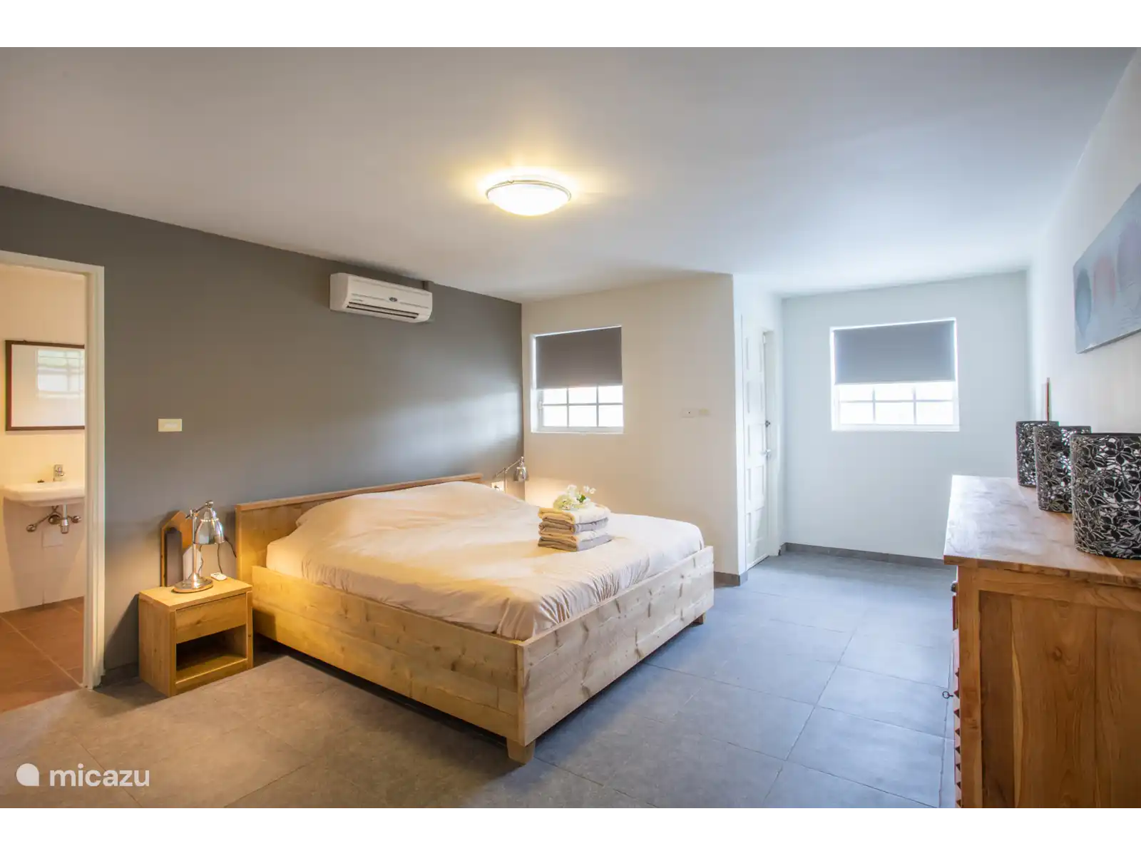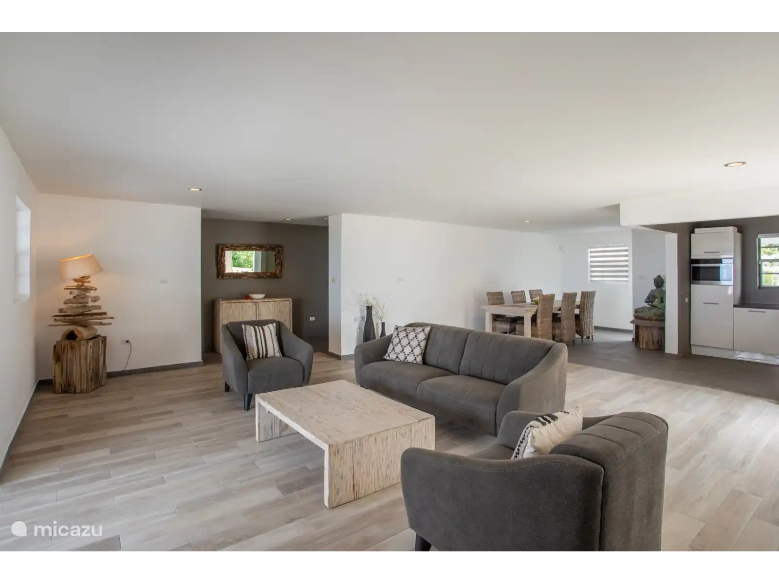 L’entrée principale se trouve au rez-de-chaussée avec une cuisine et un salon spacieux. Le téléviseur intelligent de 65 pouces dispose de différents services de streaming prêts à l’emploi tels que Netflix, Amazon Prime et Videoland. Les mélomanes peuvent écouter Spotify via le Nest Hub Max. De plus, il y a 3 chambres climatisées et 2 salles de bains au rez-de-chaussée. Le salon dispose également de la climatisation. La chambre principale dispose d’un lit double et les deux autres chambres ont toutes deux 2 lits simples.