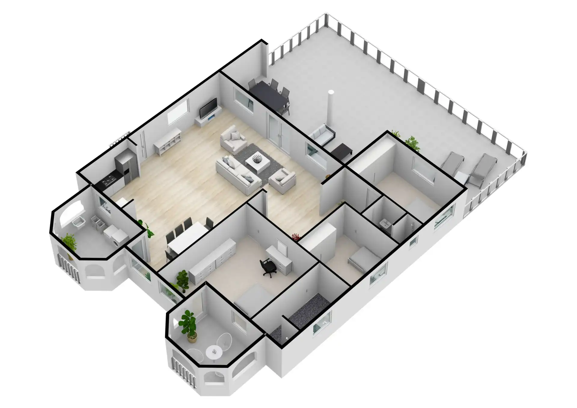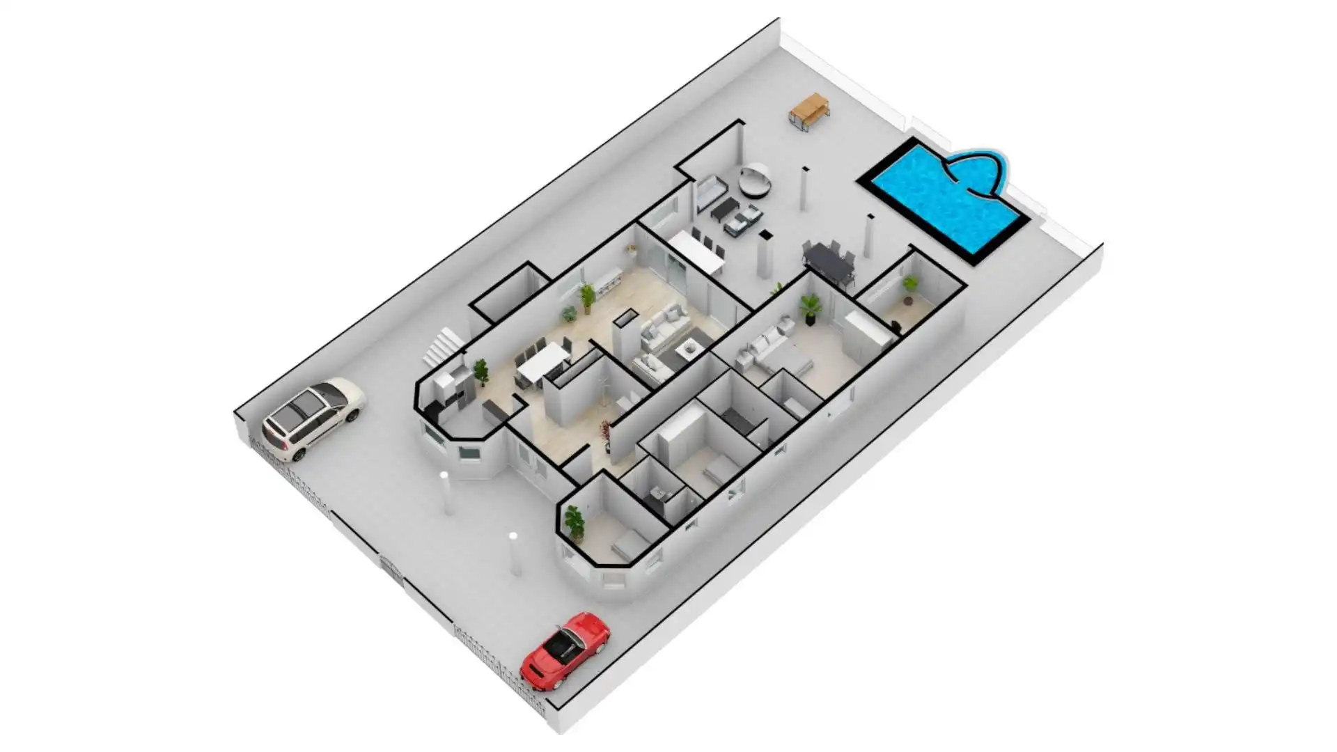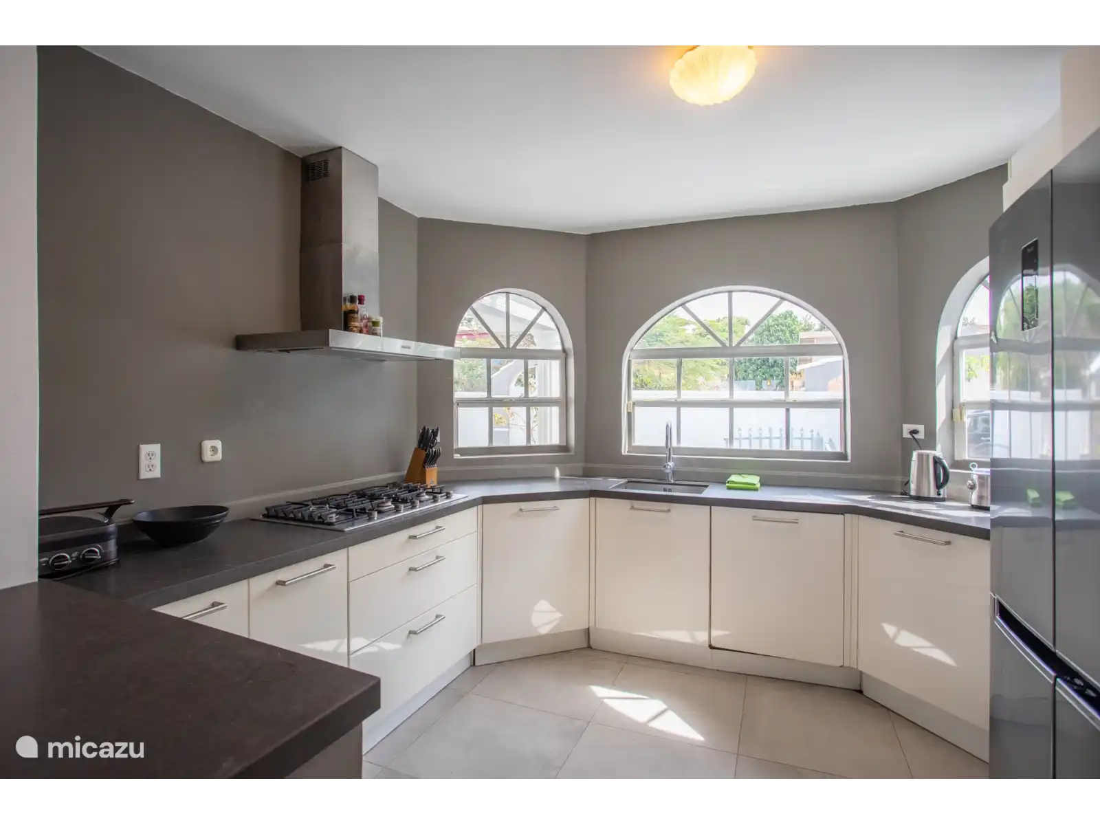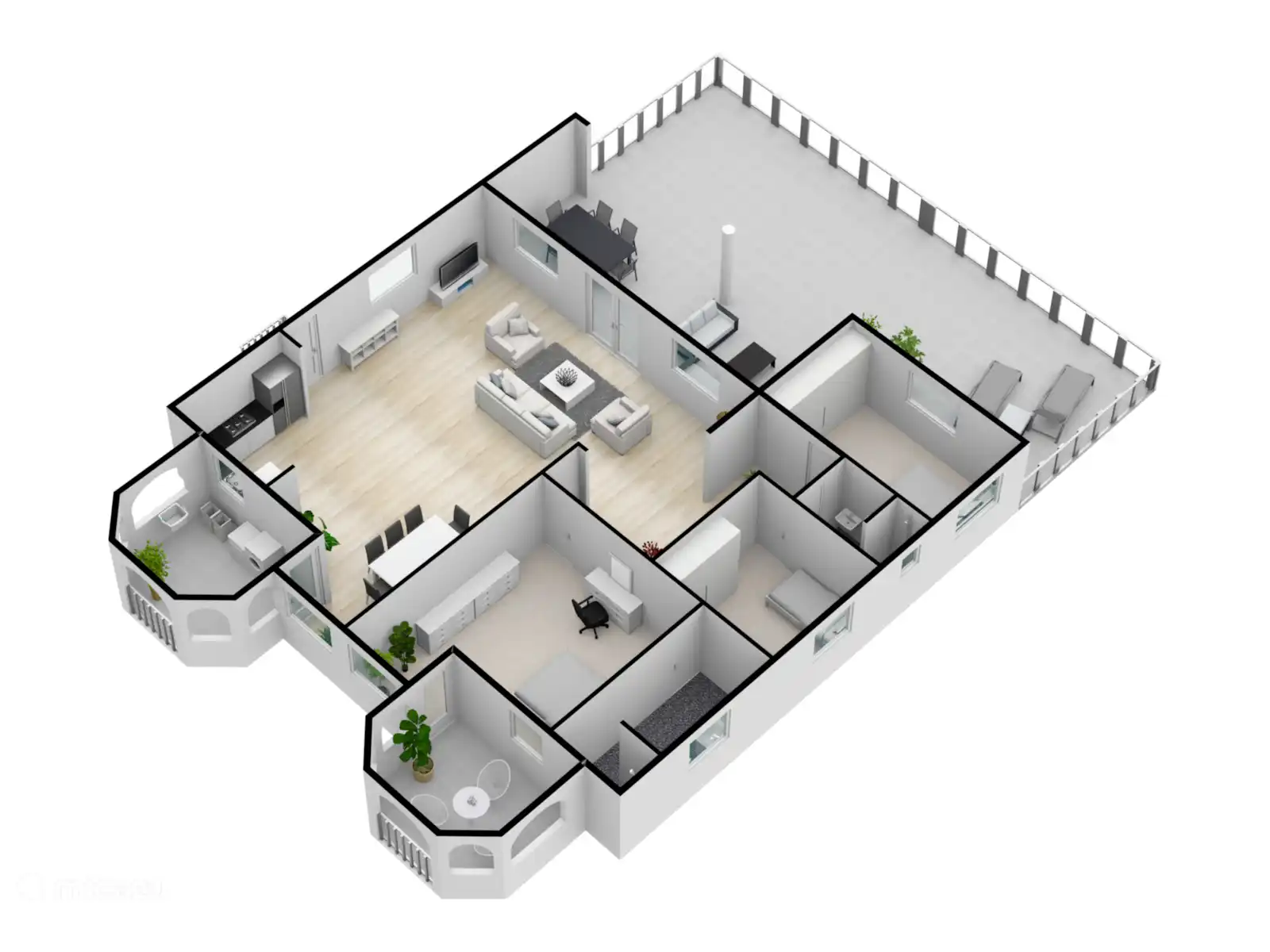 L’entrée principale se trouve au rez-de-chaussée avec une cuisine et un salon spacieux. Le téléviseur intelligent de 65 pouces dispose de différents services de streaming prêts à l’emploi tels que Netflix, Amazon Prime et Videoland. Les mélomanes peuvent écouter Spotify via le Nest Hub Max. De plus, il y a 3 chambres climatisées et 2 salles de bains au rez-de-chaussée. Le salon dispose également de la climatisation. La chambre principale dispose d’un lit double et les deux autres chambres ont toutes deux 2 lits simples.