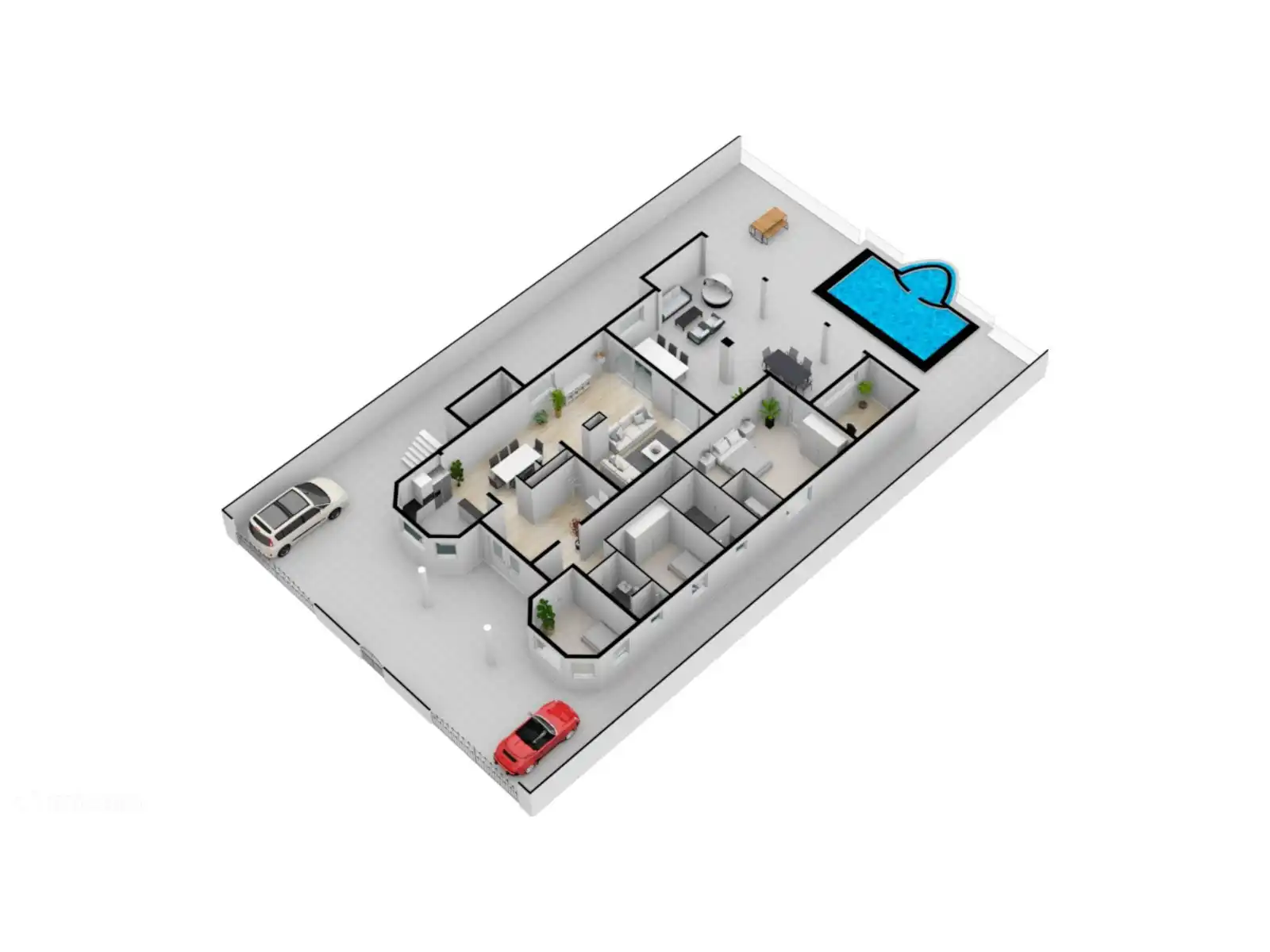 Il y a 2 portes qui permettent d’accéder à la maison où 2 voitures peuvent être garées à l’intérieur des portes. De plus, il est toujours possible de garer 1 voiture directement devant la maison à l’extérieur du portail, de sorte que vous pouvez garer un total de 3 voitures.