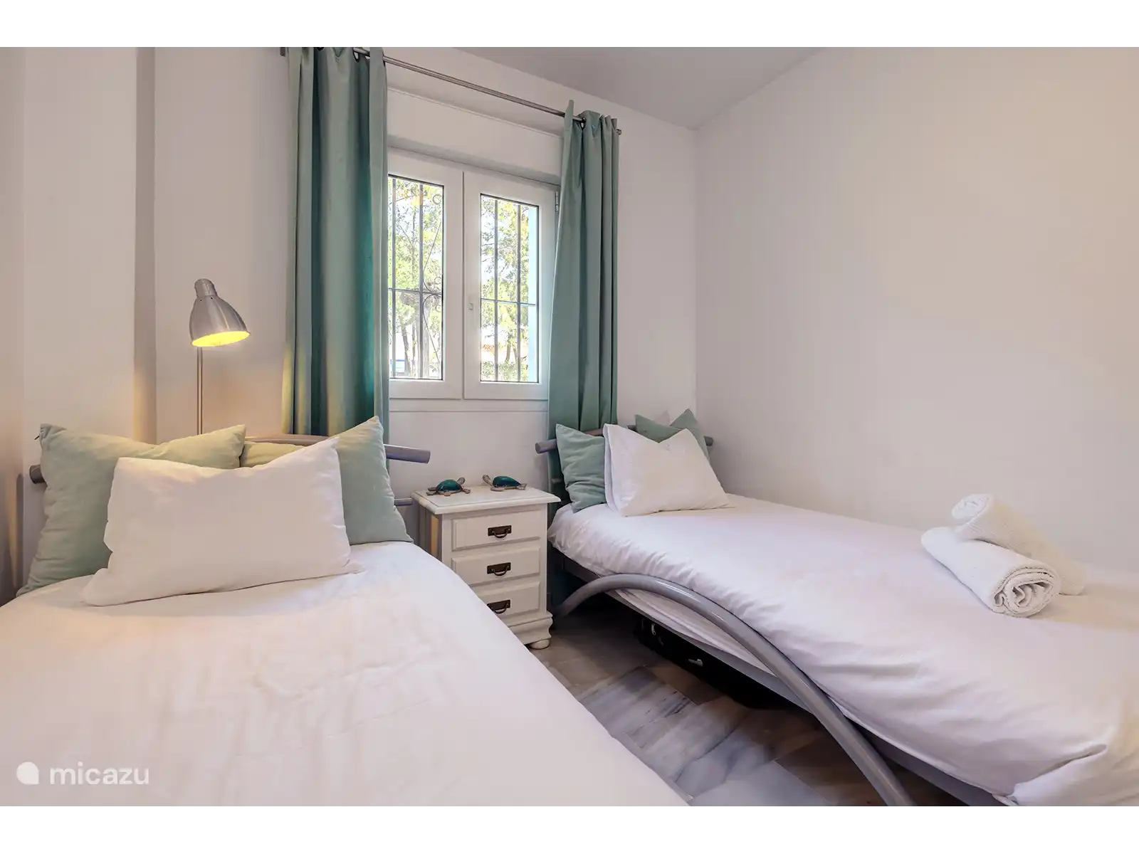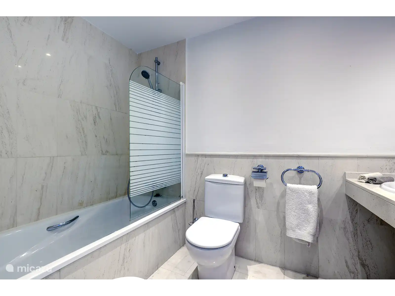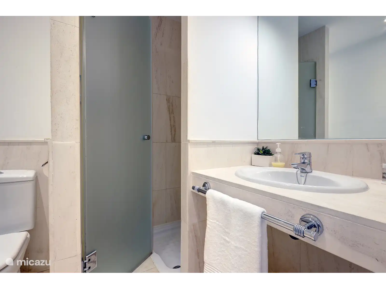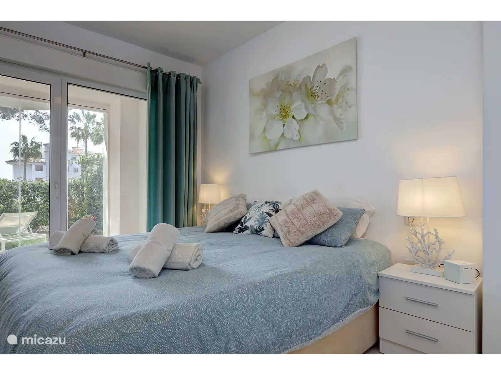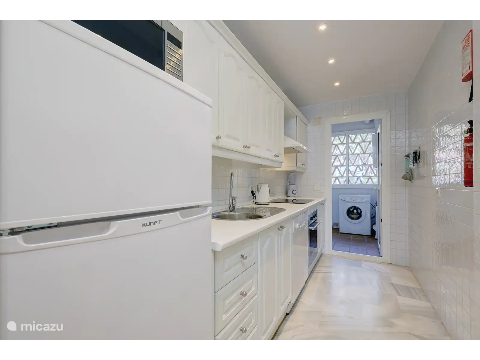 Cet appartement au rez-de-chaussée comprend 2 chambres avec armoires encastrées, 2 salles de bain complètes, une cuisine et une buanderie entièrement équipées, un patio et un jardin privé.