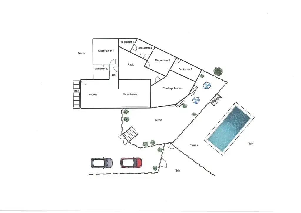 De la terrasse couverte, un escalier en pierre vous mène aux terrasses inférieures avec parasols et transats et directement adjacentes à la piscine privée de 8 x 4 mètres. L'accès à la piscine peut être fermé par un portail.
