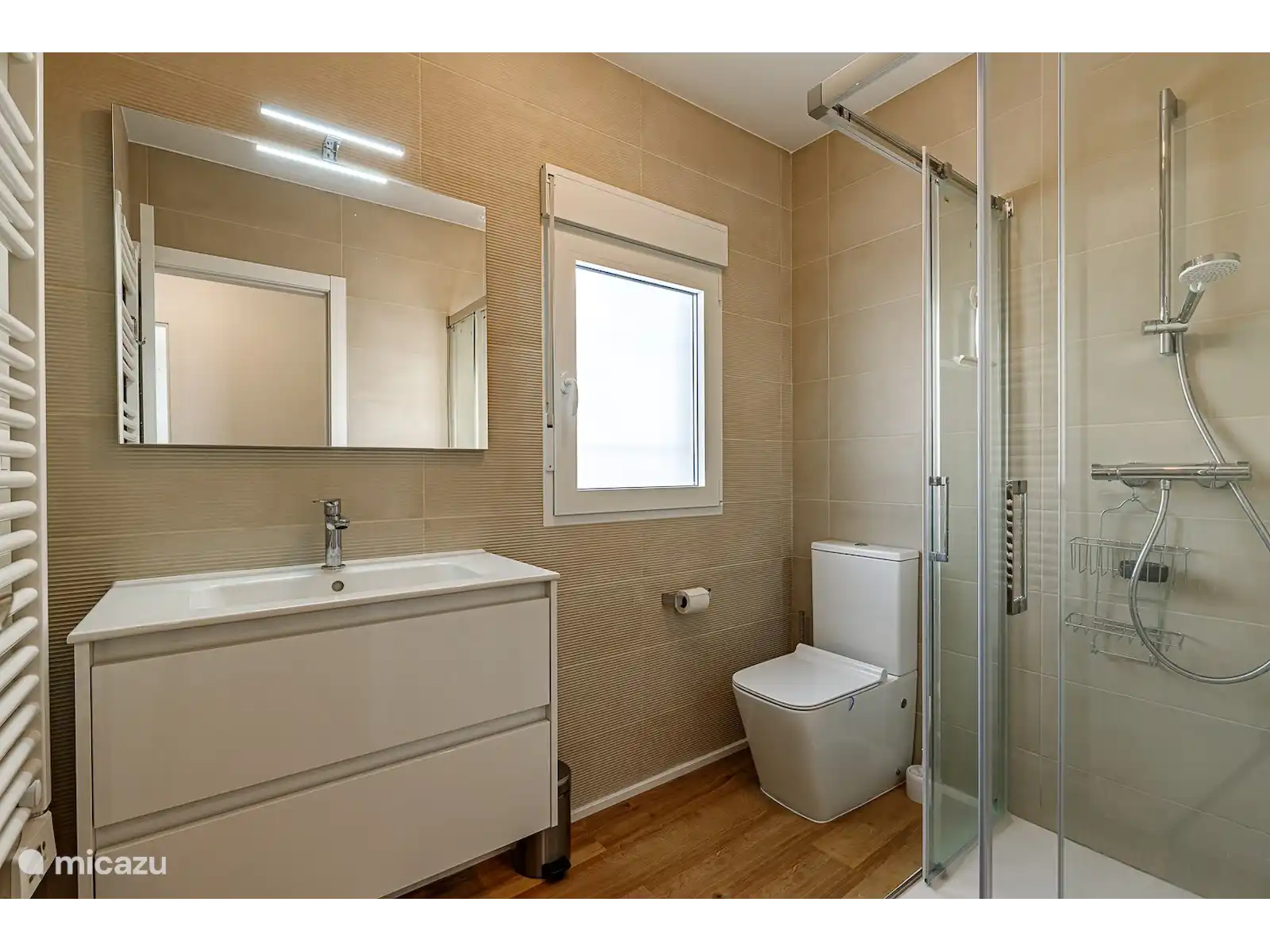 - Salle de bain attenante avec lavabo simple, douche, toilettes et sèche-cheveux