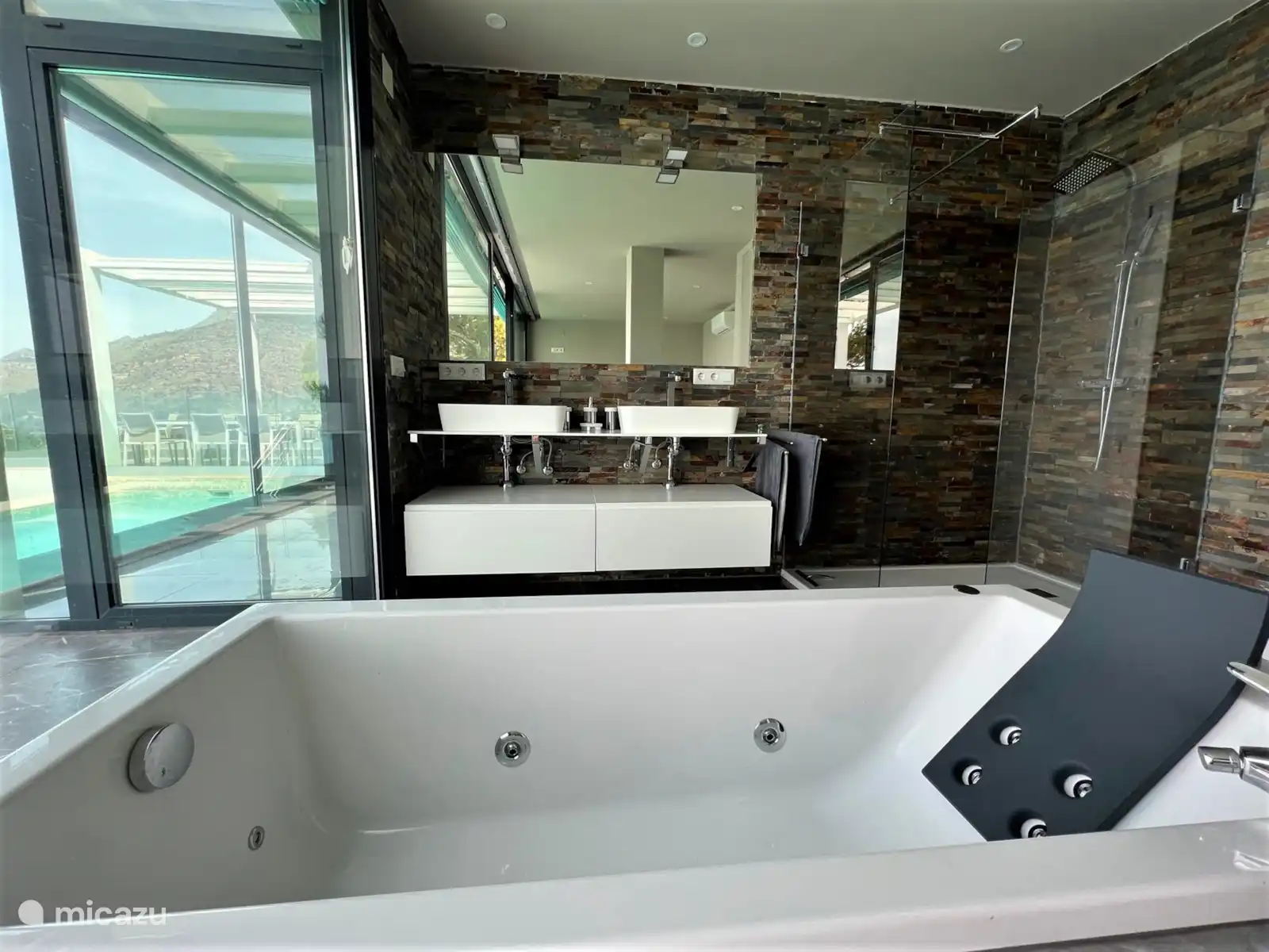 La maison dispose de 2 chambres, 1 salle de bain et 1 toilette invités, réparties sur 2 étages. Le logement offre de l'intimité, une belle piscine et de belles vues sur la baie, sur la mer, sur la montagne, sur la ville et sur le port. Le confort et la proximité de la plage et les possibilités de pratique du sport en font une maison de vacances idéale pour célébrer vos vacances en famille ou entre amis.