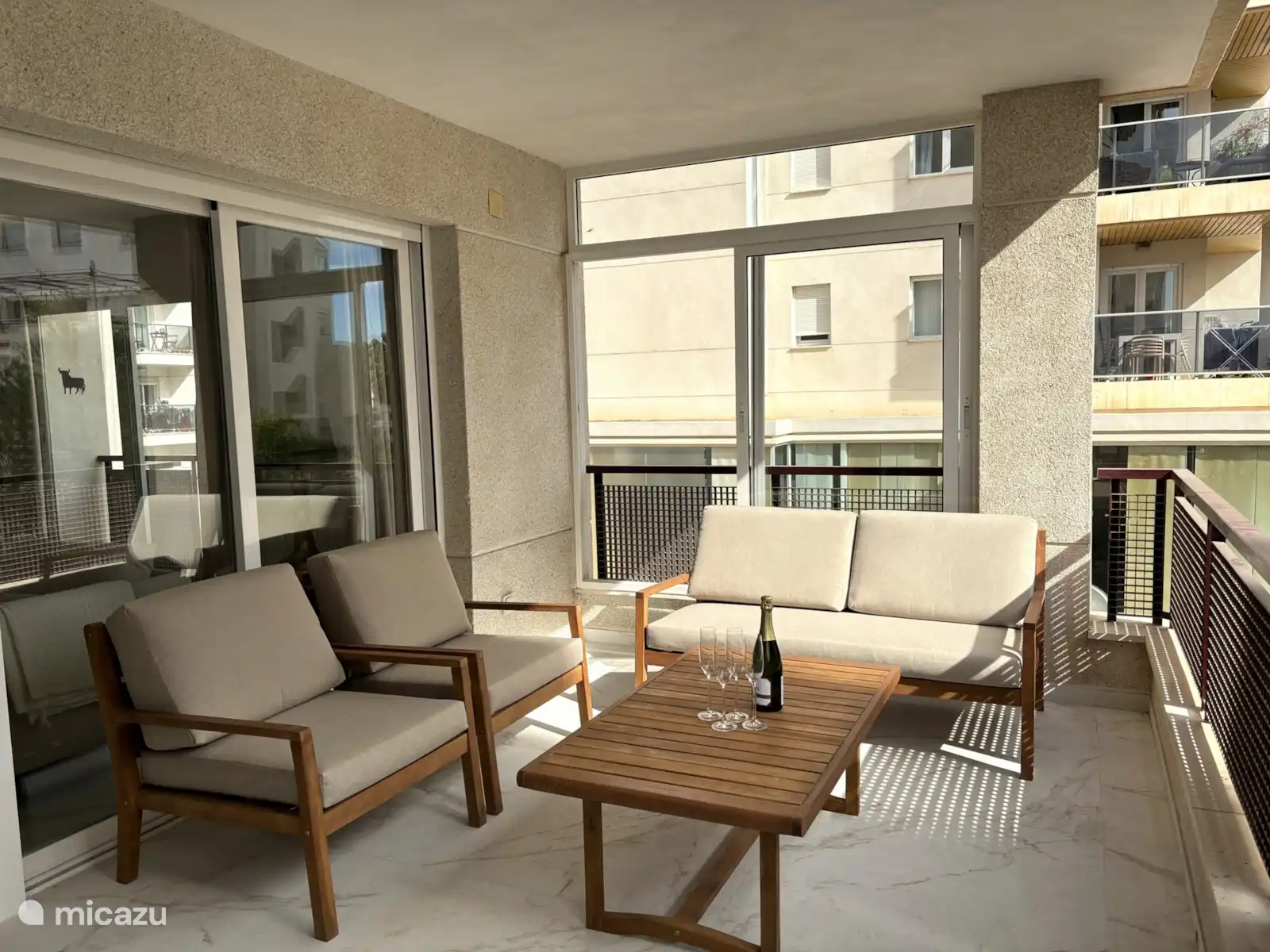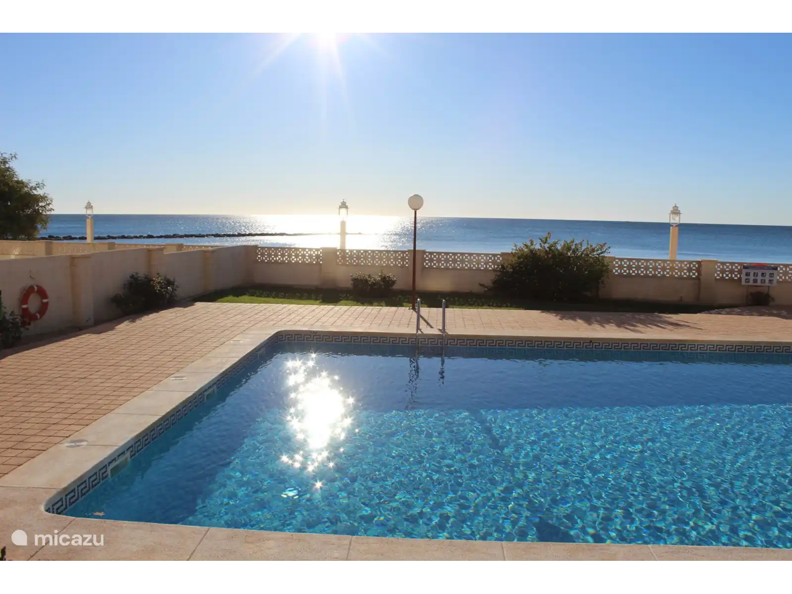 De l’espace de vie, vous passez par les portes coulissantes sur la terrasse spacieuse (à l’est). Il y a une table à manger avec 4 chaises et il y a un coin salon. Il y a aussi une piscine extérieure commune. De la piscine, vous pouvez marcher jusqu’à la plage de Platja de l’Espigo.