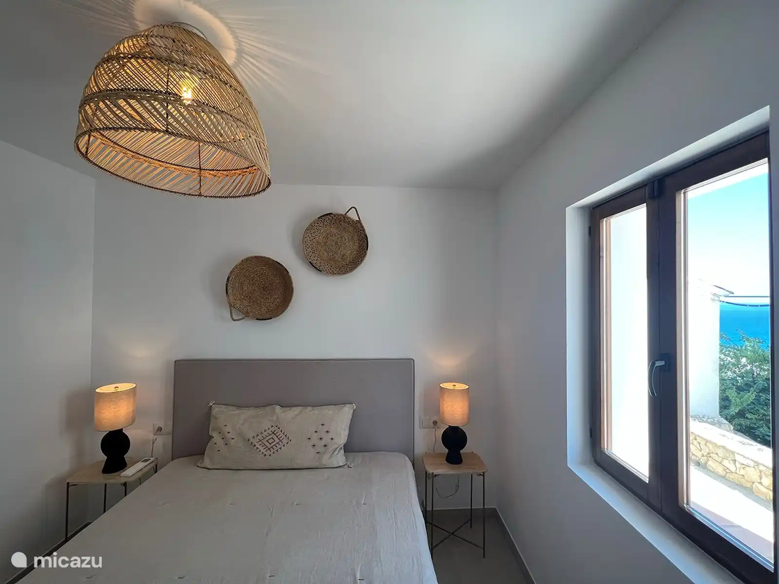 L’étage supérieur est accessible par les escaliers où se trouve la cuisine ouverte moderne avec îlot de cuisson avec plaque à induction. Il est entièrement équipé : four à micro-ondes, lave-vaisselle, lave-linge et entièrement meublé avec toute la vaisselle et les ustensiles de cuisine nécessaires. De plus, il y a une belle table à manger avec quatre chaises confortables avec un bel éclairage d’ambiance. Dans le coin salon, vous pourrez vous détendre, regarder la télévision ou profiter de la vue. À côté, il y a une terrasse ensoleillée sur le toit avec une toile d’ombrage. Il y a une table extérieure avec quatre chaises et deux chaises longues. Ici, vous pourrez bronzer, prendre un verre et une collation et profiter de la belle vue sur la mer et le village historique.