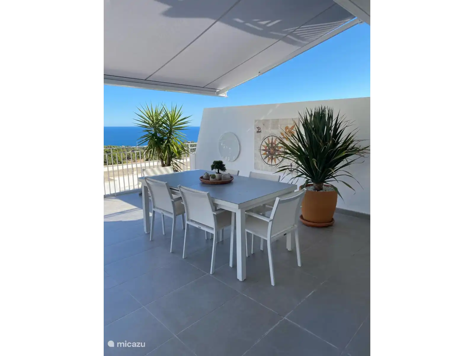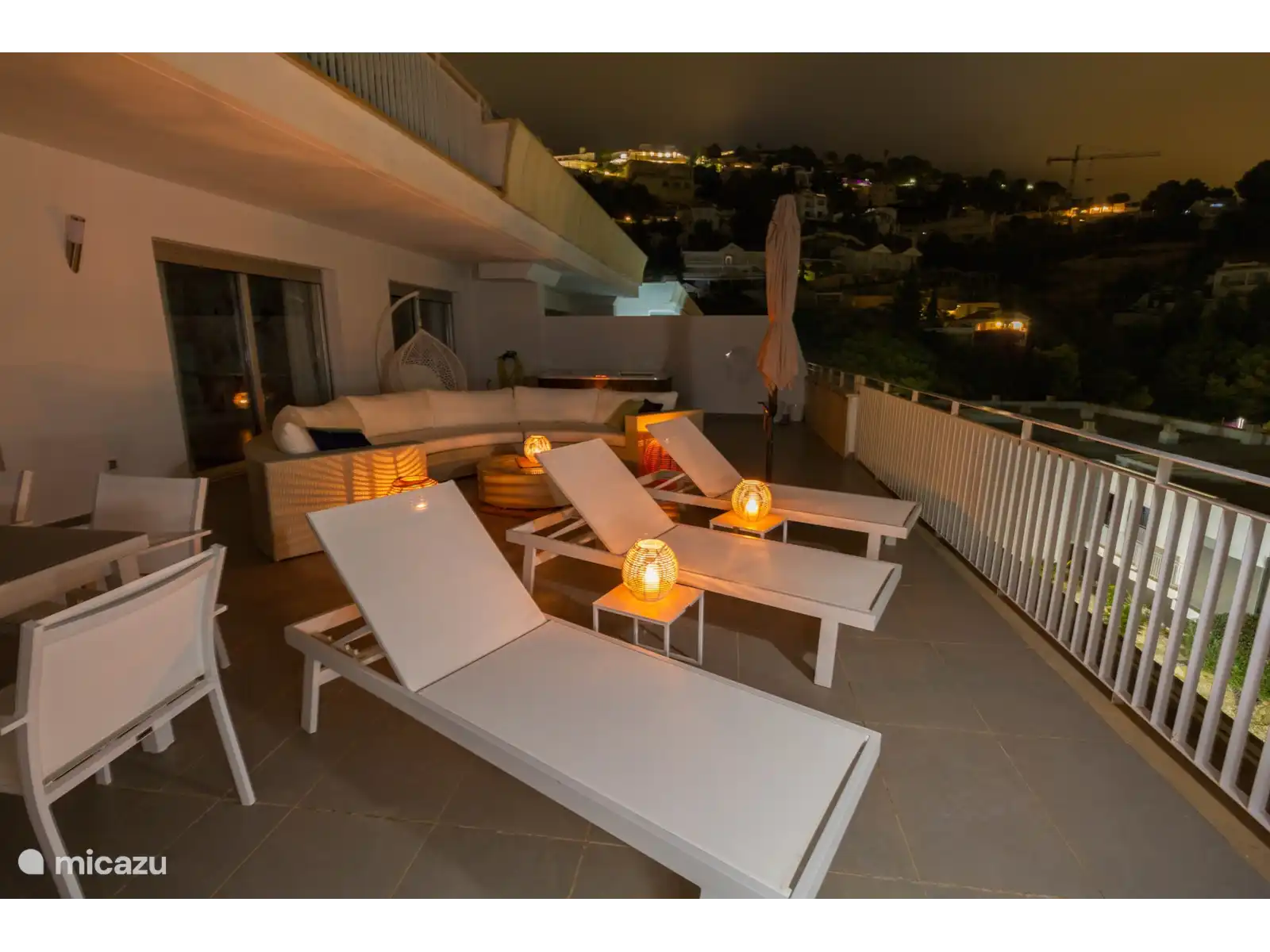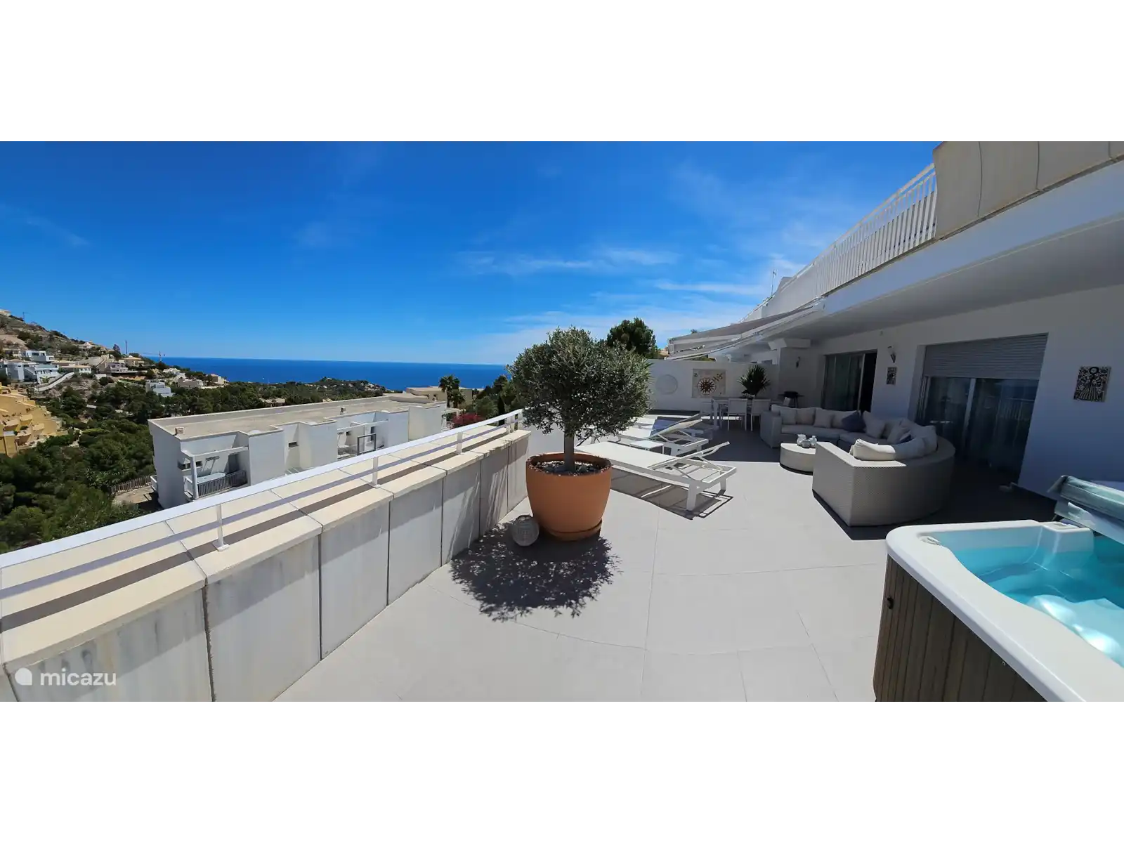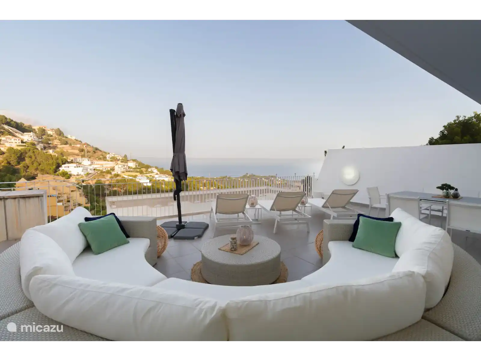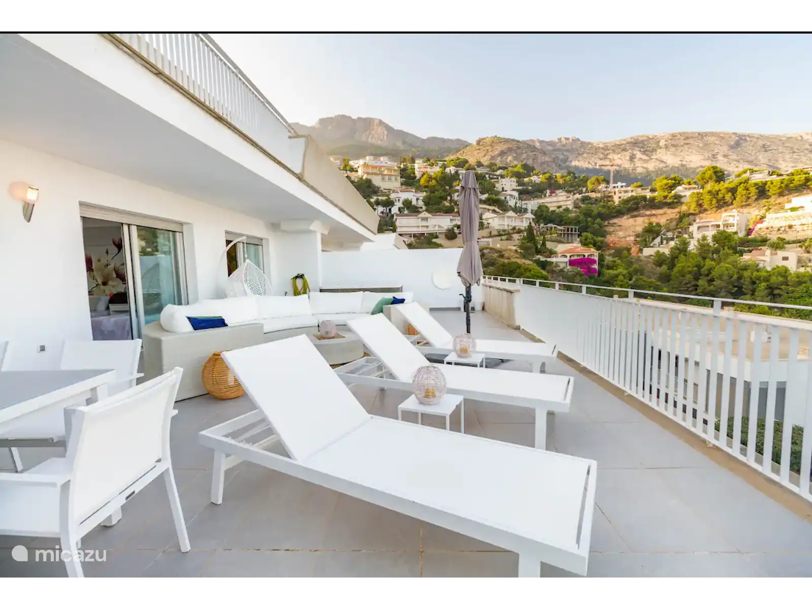 • Terrasse : espace de détente, chaises longues, jacuzzi et table à manger pour 10 personnes avec une vue imprenable sur la baie d’Altea et les collines de Bernia.