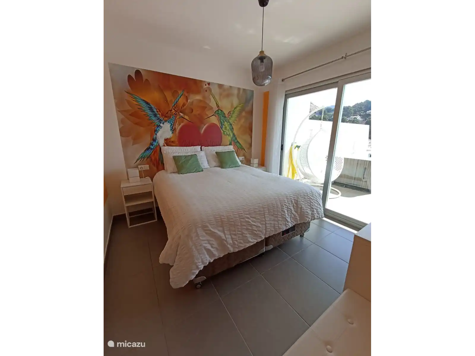 • Chambre 1, principale : lit king size, salle de bain privée avec baignoire et un lavabo, accès direct à la terrasse, vue sur la mer et les montagnes.