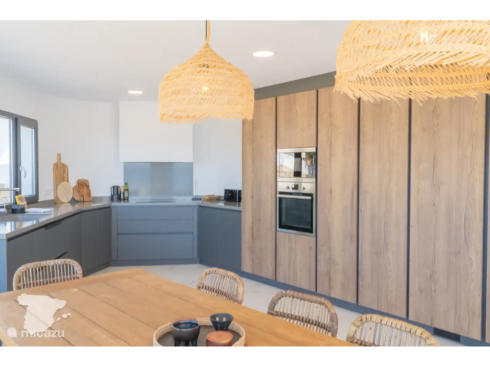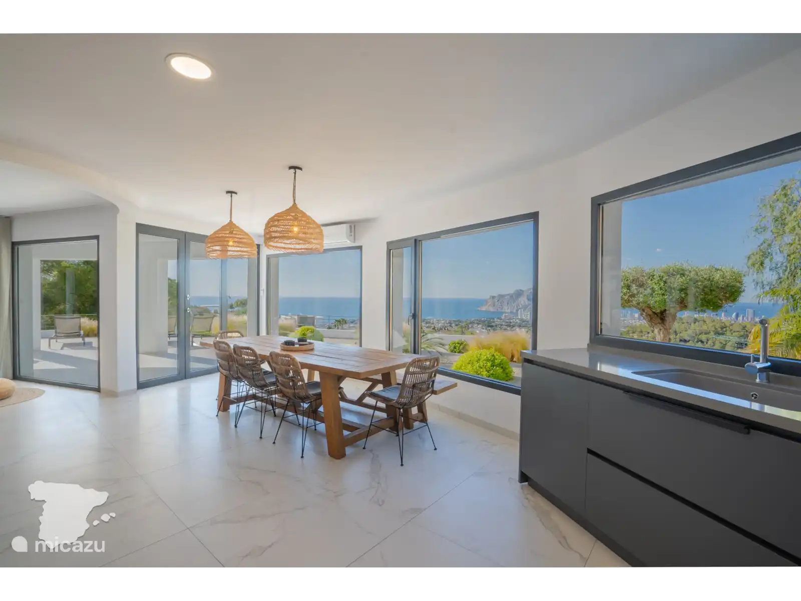 Nous entrons dans la villa dans l’espace de vie lumineux et ouvert équipé d’un canapé confortable et d’une Smart TV avec Chromecast. Il y a une belle cuisine ouverte avec table à manger pour 8 personnes et une vue fantastique sur la mer. C’est un espace fantastique où vous pourrez déguster de délicieux repas avec vos proches. La cuisine est équipée d’un réfrigérateur, d’un congélateur, d’une plaque à induction 4 zones, d’un four, d’un micro-ondes, d’une bouilloire, d’une machine Nespresso, d’un grille-pain et d’un lave-vaisselle.