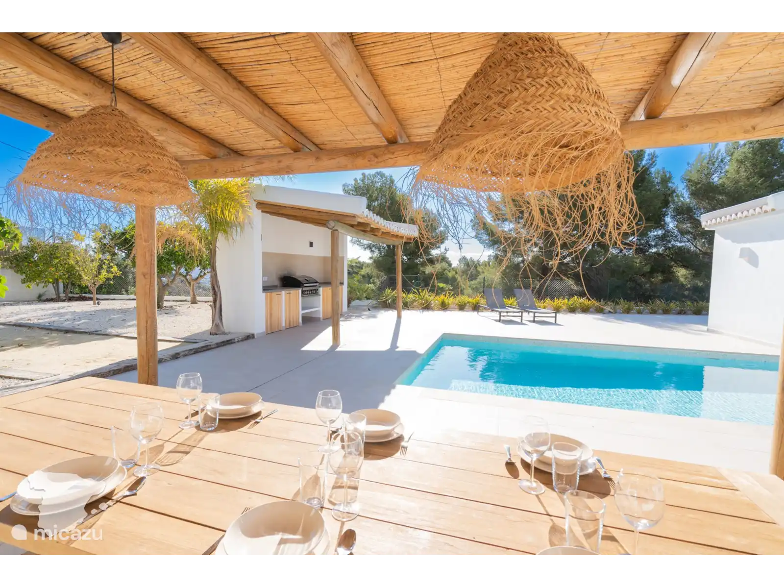 Au bord de la piscine se trouve une cuisine d’été avec réfrigérateur et barbecue, ainsi qu’un coin repas pour que vous puissiez dîner en plein air avec votre famille et vos amis. Une salle de bain extérieure avec douche et toilettes offre plus de commodité, tandis qu’un garage couvert avec laveuse et sécheuse garantit que vos besoins en matière de lessive sont satisfaits.