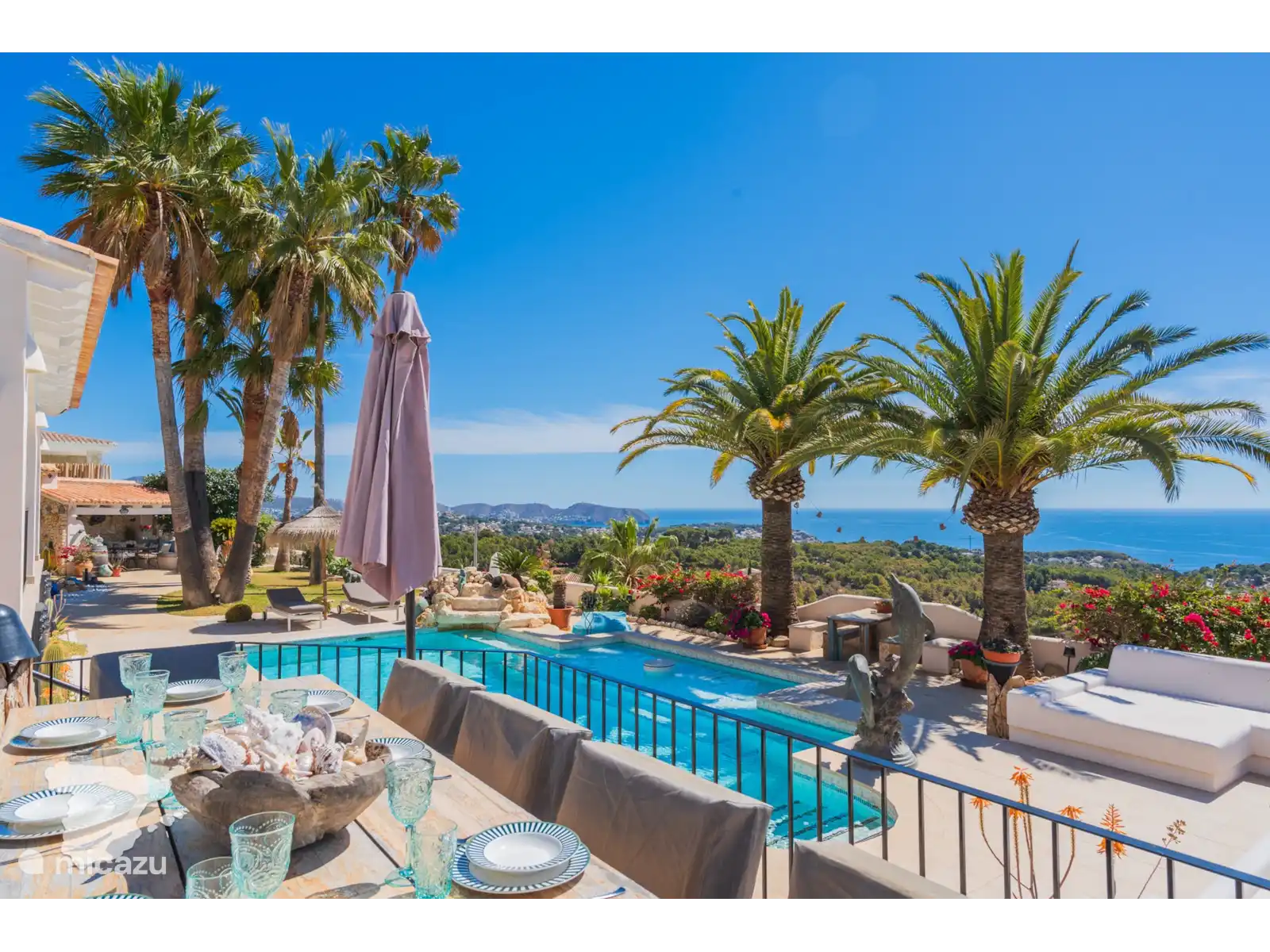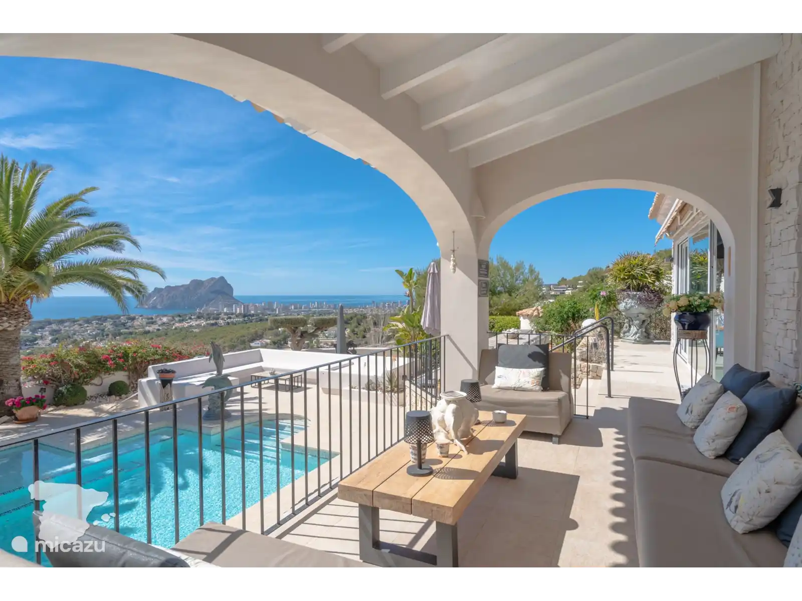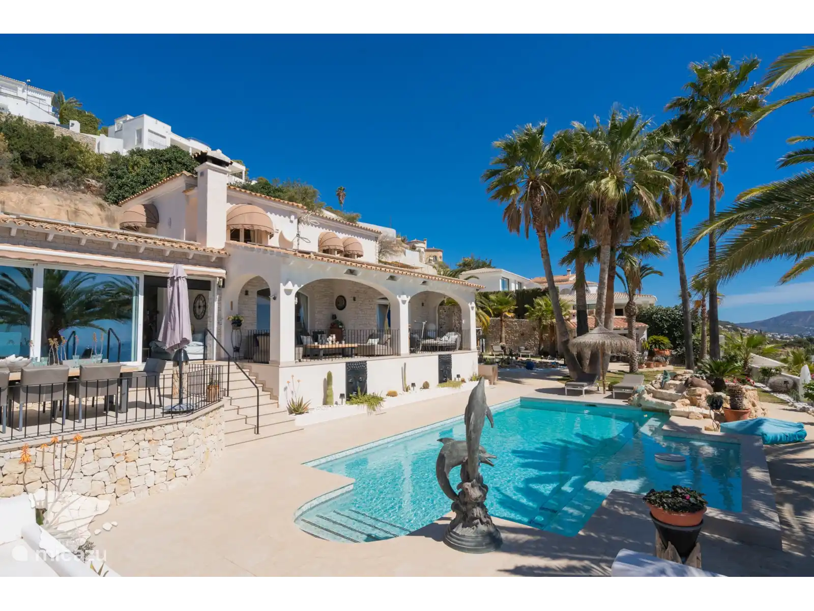 Profitez de la spacieuse cuisine extérieure couverte, équipée d’un coin repas et d’un barbecue, idéale pour les repas en plein air. De nombreux salons confortables et des chaises longues accueillantes vous invitent à vous détendre tout en profitant de la vue à couper le souffle, le tout dans les limites d’un jardin entièrement clôturé.