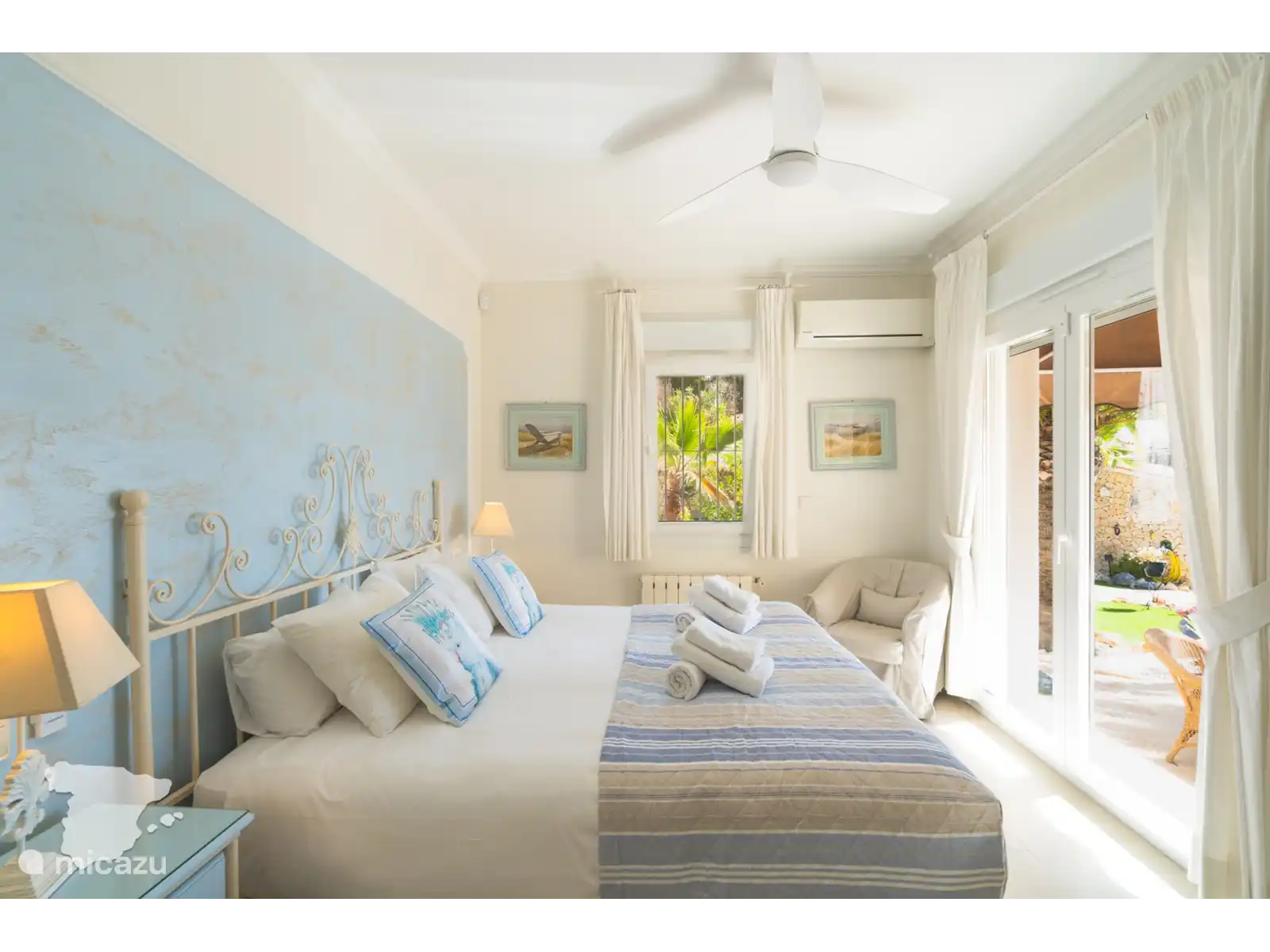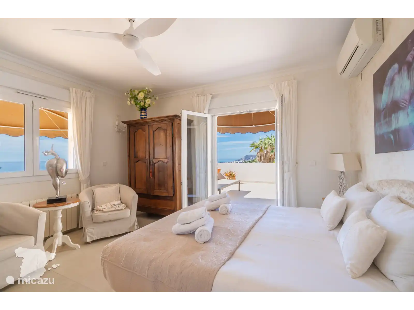 Montez au deuxième étage et découvrez la troisième chambre, meublée avec deux lits simples, la climatisation, un ventilateur, une télévision avec TV Vlaanderen et une armoire. La salle de bain attenante dispose d’une douche à l’italienne, de toilettes et d’un double lavabo, tandis que la chambre donne également accès à un balcon, parfait pour profiter du soleil du soir et des vues envoûtantes.