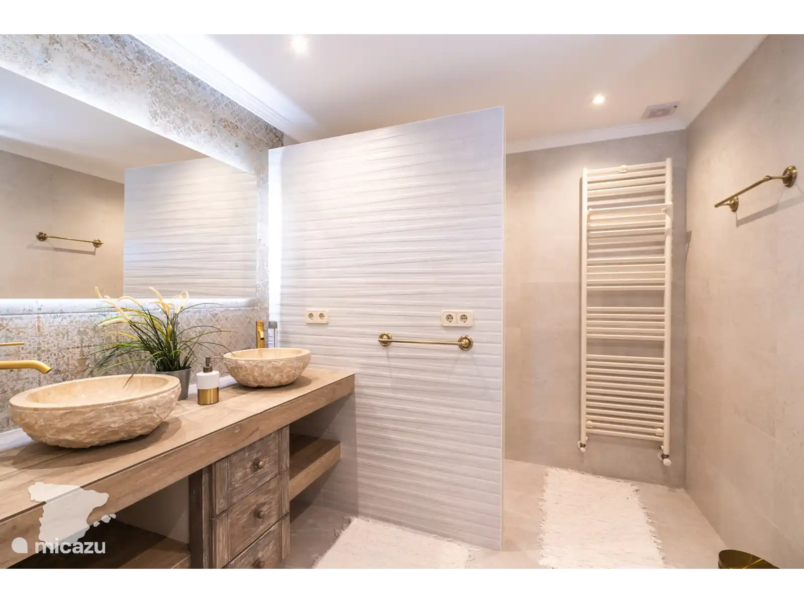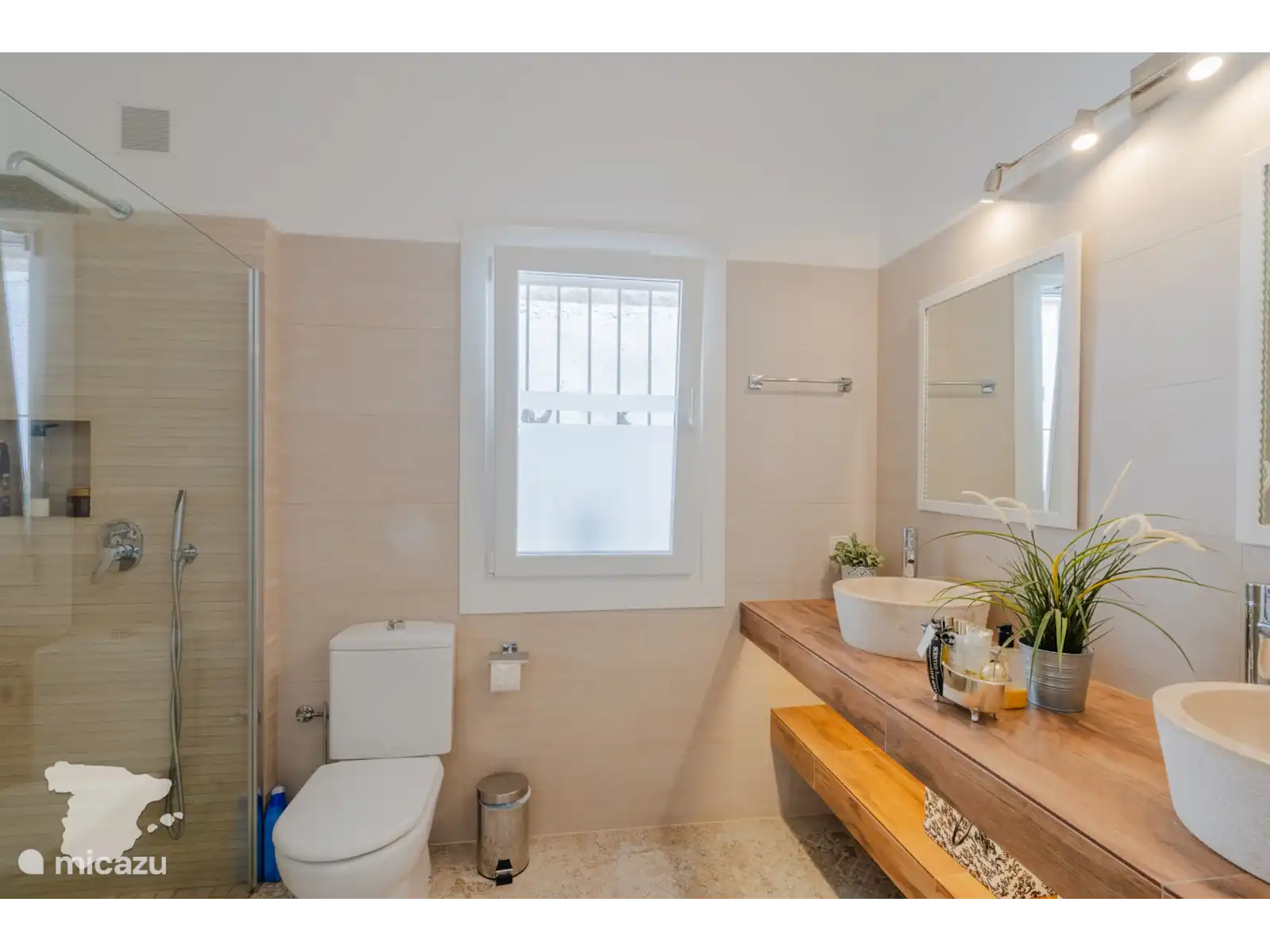 Plus loin dans le couloir, vous trouverez une autre salle de bain spacieuse avec douche à l’italienne, toilettes et double lavabo, suivie de la deuxième chambre, meublée d’un lit double confortable, de la climatisation, d’un ventilateur et d’une armoire.