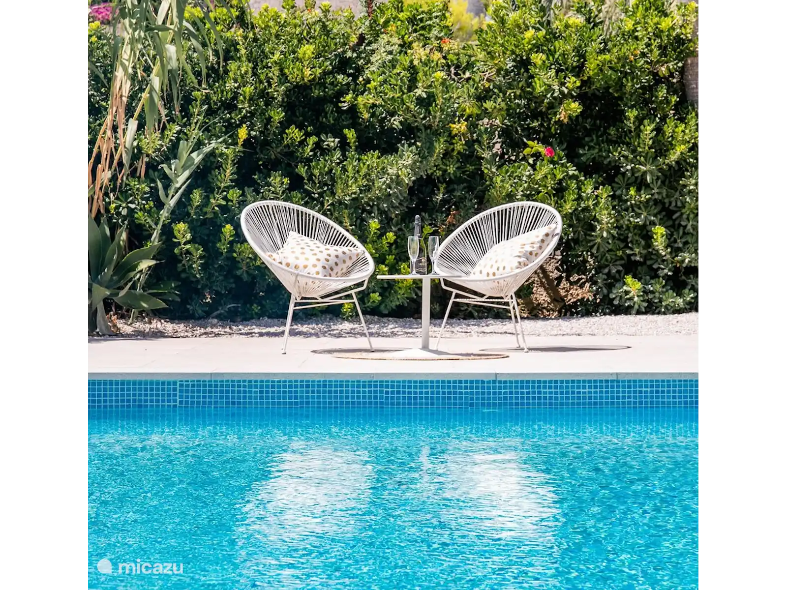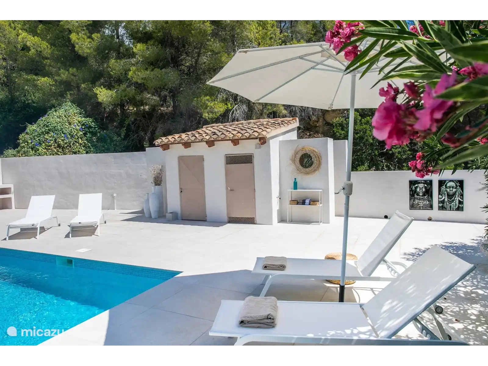 Les propriétaires flamands ont veillé à ce que vous ayez de nombreuses heures agréables sur la terrasse extérieure sous la véranda. Une tasse de café le matin ou des heures de dîner en fin de journée. Vous avez une belle vue sur la belle piscine (8x4 m). La piscine est située au centre avec quatre chais-longs, deux parasols, des toilettes séparées, une douche extérieure, un espace salon et un espace salon. La cuisine extérieure a un magnifique toit, une grande table à manger, un barbecue au gaz, de l’eau (chaude/froide) et un réfrigérateur. Nous voulons mettre en valeur le fond vert de la villa. Un lieu unique.