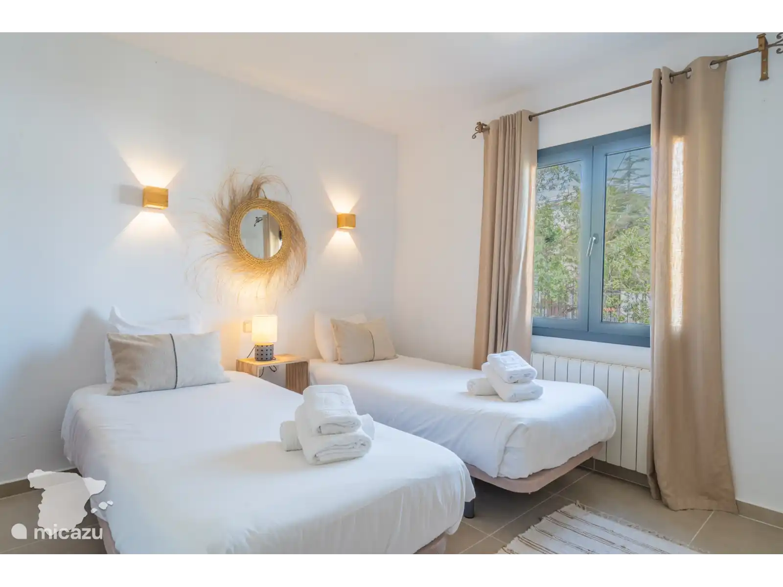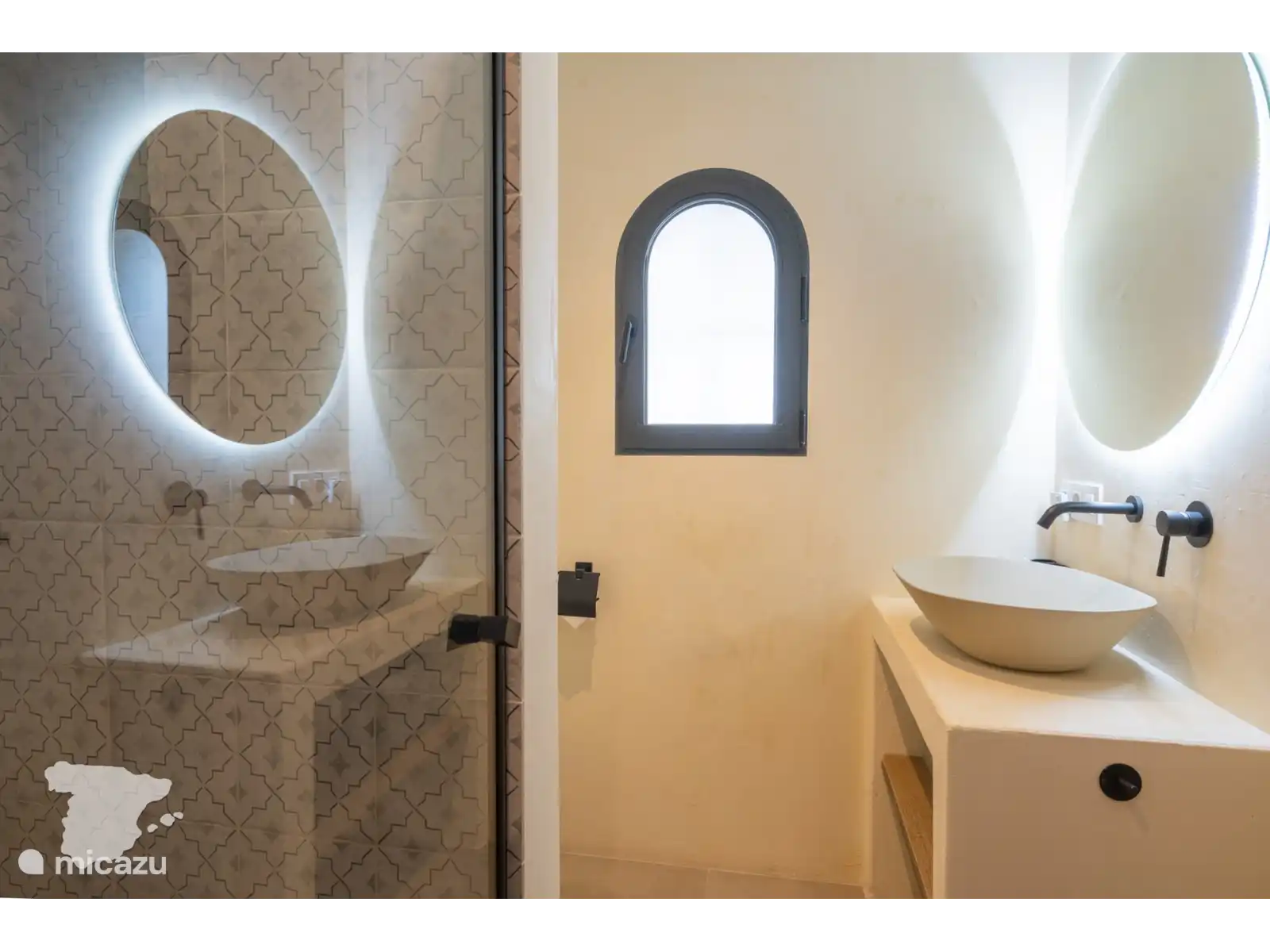 Lorsque vous descendez les escaliers, vous entrez dans la troisième chambre. Les deux chambres de cet étage sont confortablement meublées avec un lit double, la climatisation et une armoire. Cette salle de bain est également située dans le couloir et est équipée d’une douche à effet pluie, de toilettes et d’un lavabo.