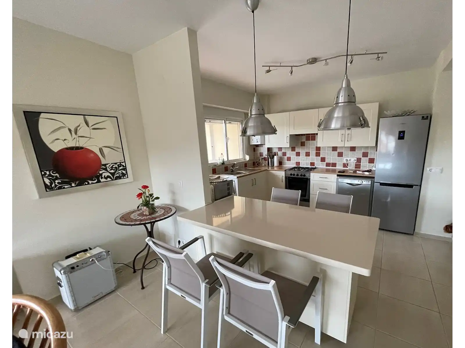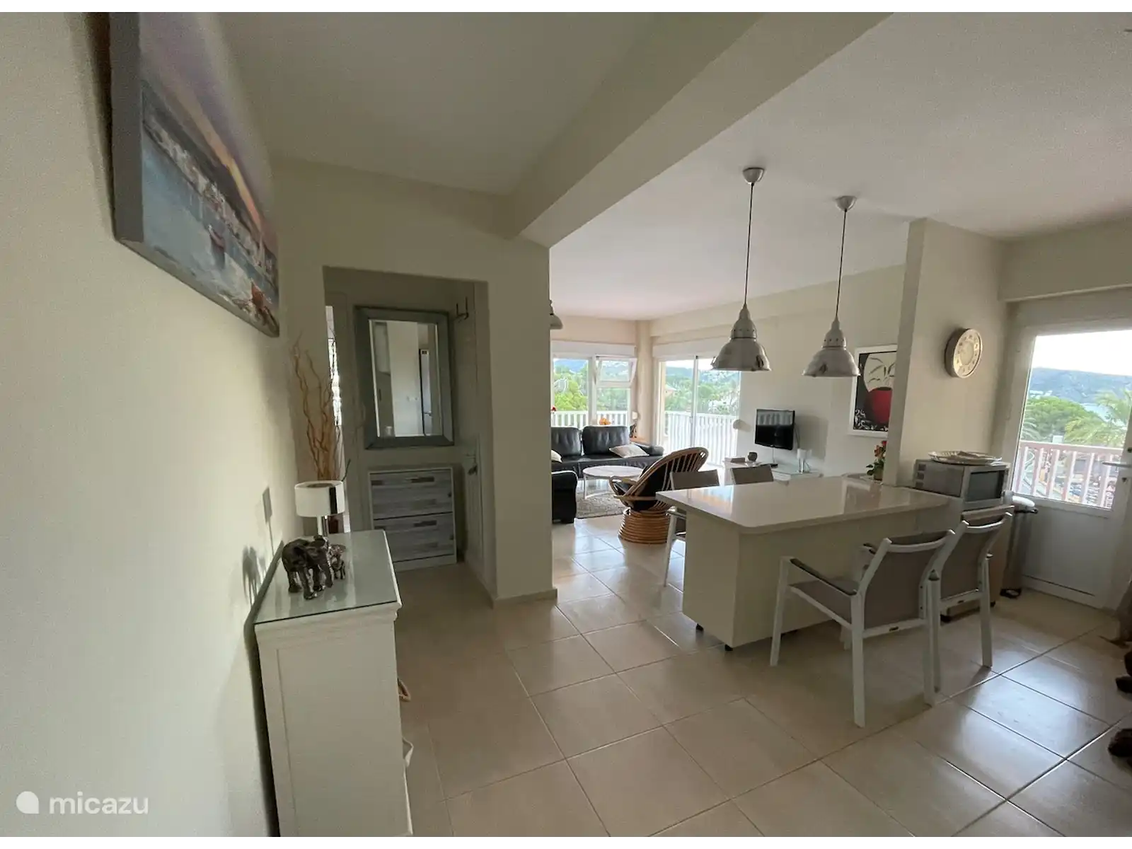Vous pouvez vous asseoir et manger confortablement dans le salon lumineux. Le spacieux balcon en forme de L dispose de sièges pour prendre un café ou un verre en fin de soirée. La cuisine est complète et offre tout ce dont vous avez besoin pour cuisiner ou faire des tapas (cuisinière, four, lave-vaisselle, micro-ondes, lave-linge, combiné réfrigérateur-congélateur)