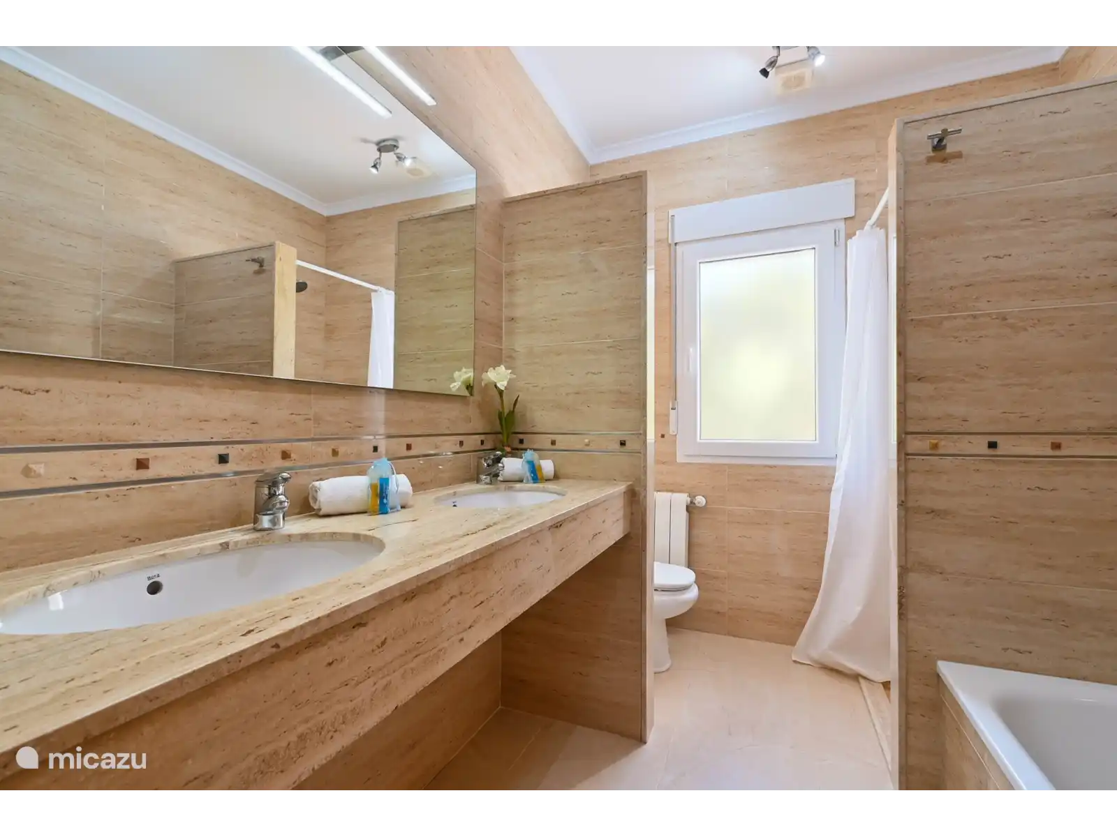 - Salle de bain avec double vasque, baignoire, douche et WC