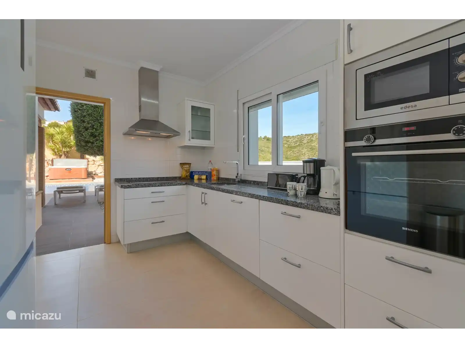 - Cuisine avec plaques électriques, four électrique, micro-ondes, lave-vaisselle, réfrigérateur-congélateur, machine à café, bouilloire, mixeur, grille-pain et presse-agrumes
