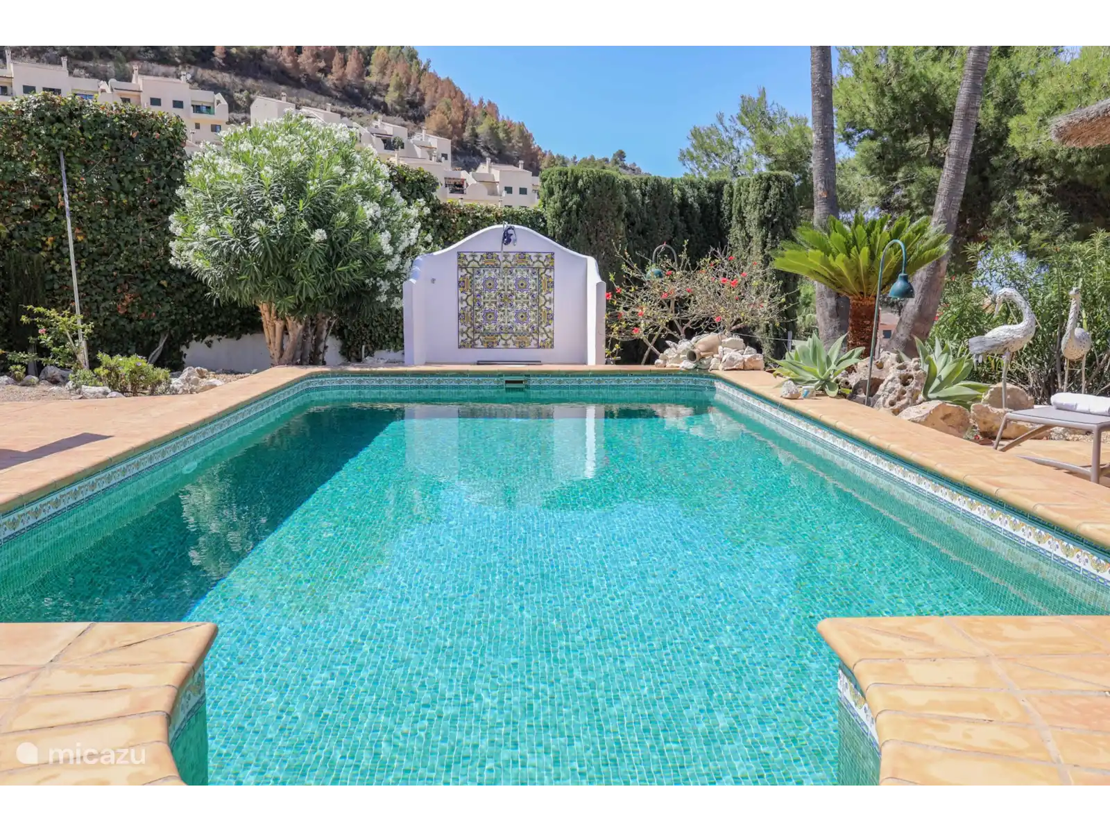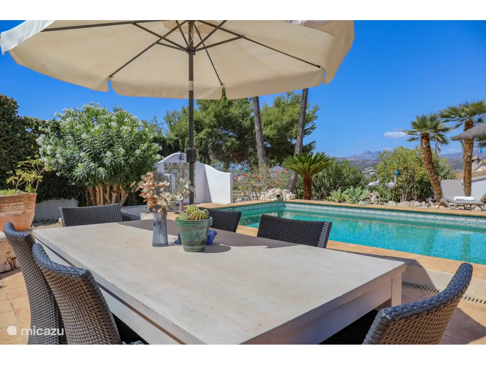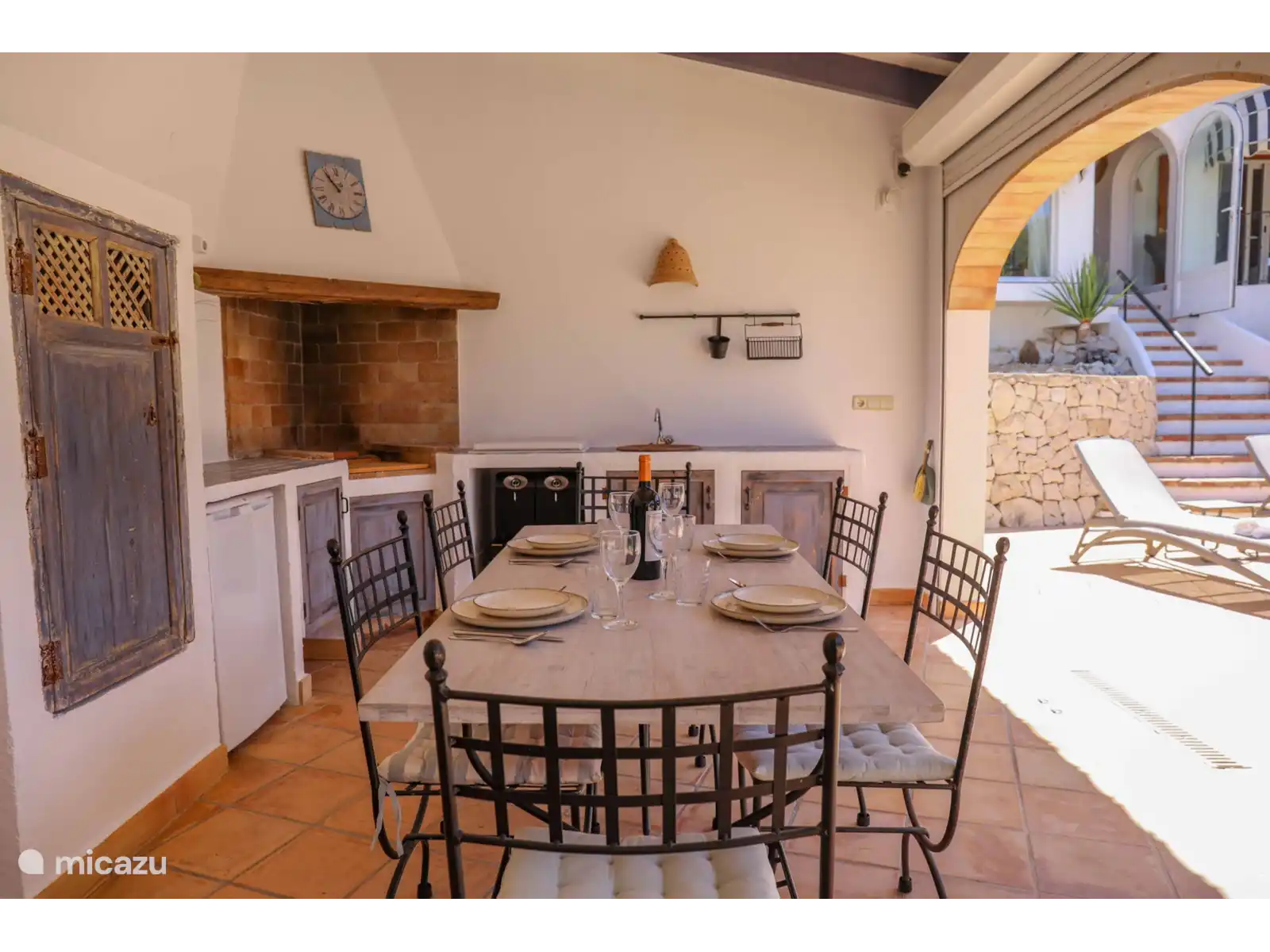 Quel joli jardin avec plusieurs espaces de repos, la piscine privée d’eau salée* (8x4 m - profondeur 0,7 à 1,9 m) de style andalou et la fantastique cuisine extérieure (verrouillable) juste à côté de la piscine. La cuisine extérieure est entièrement équipée d’une salle à manger, d’un coin salon, d’une cuisinière, d’un évier, d’un réfrigérateur, d’un barbecue (charbon) et d’un système de musique. La vue est dégagée et large et le soir, la maison, la cuisine extérieure et le jardin sont magnifiquement éclairés.