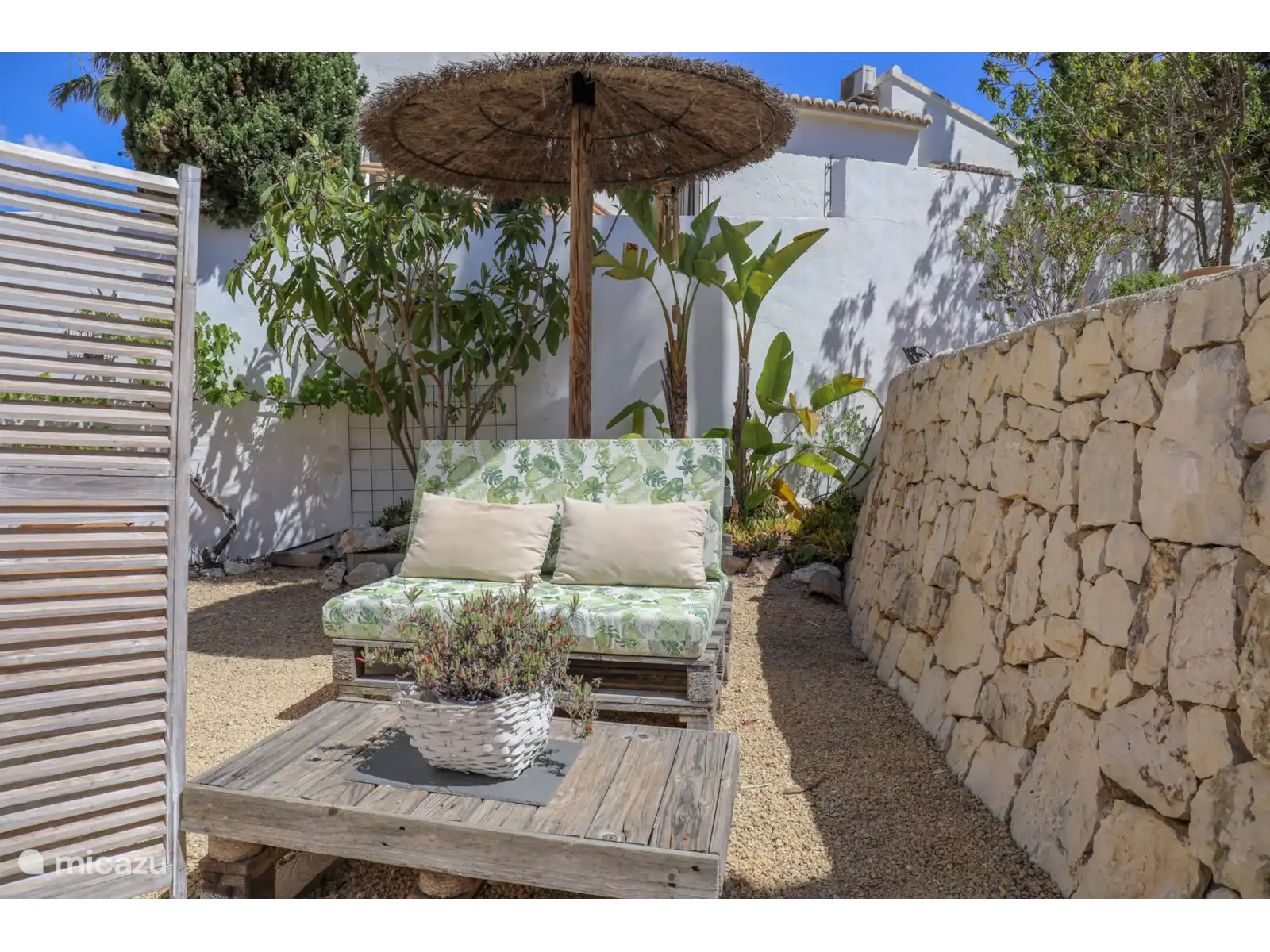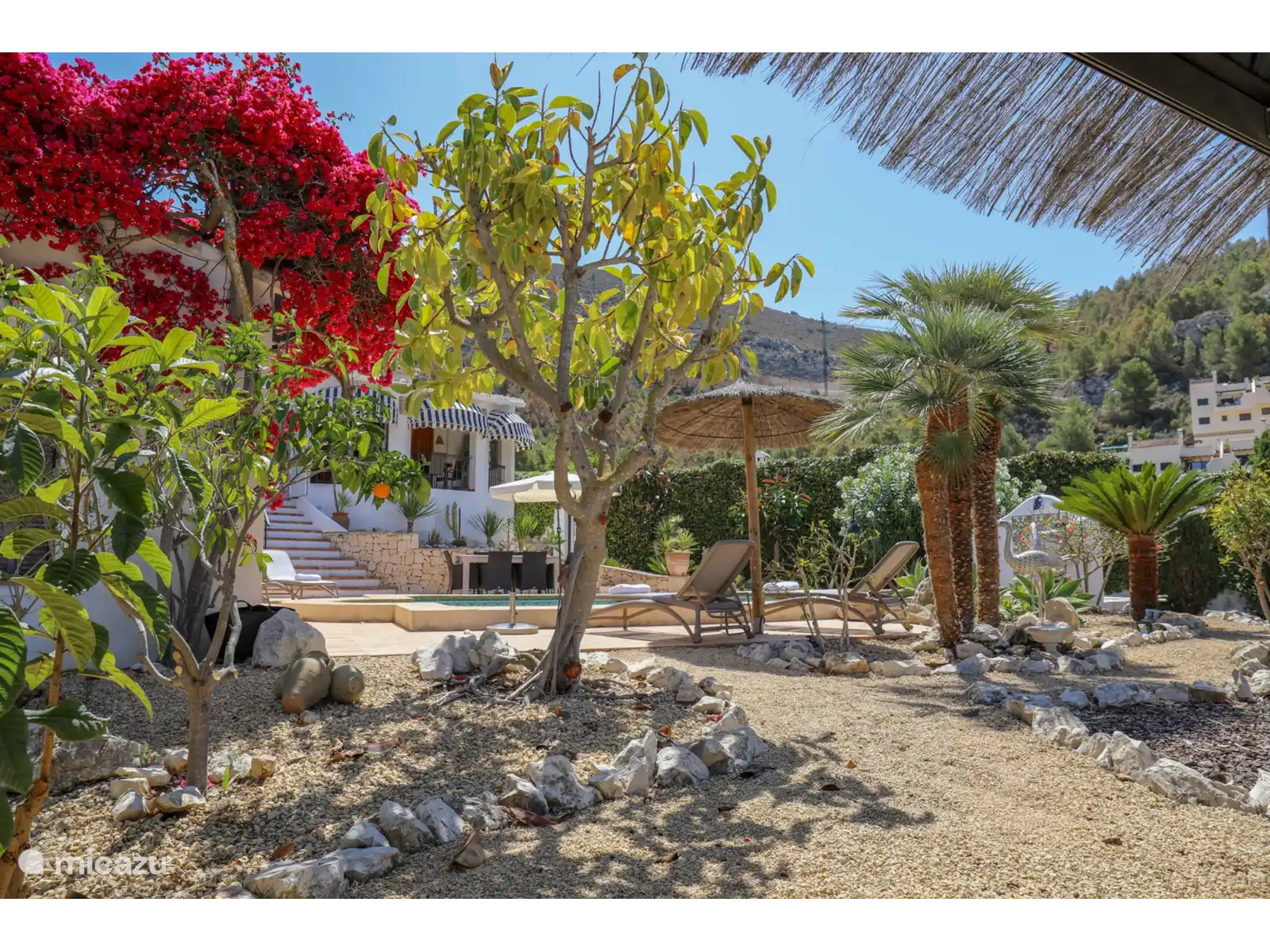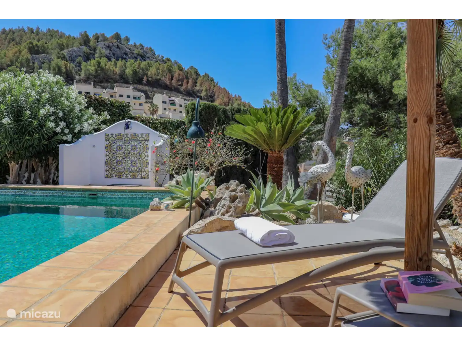 Quel joli jardin avec plusieurs espaces de repos, la piscine privée d’eau salée* (8x4 m - profondeur 0,7 à 1,9 m) de style andalou et la fantastique cuisine extérieure (verrouillable) juste à côté de la piscine. La cuisine extérieure est entièrement équipée d’une salle à manger, d’un coin salon, d’une cuisinière, d’un évier, d’un réfrigérateur, d’un barbecue (charbon) et d’un système de musique. La vue est dégagée et large et le soir, la maison, la cuisine extérieure et le jardin sont magnifiquement éclairés.