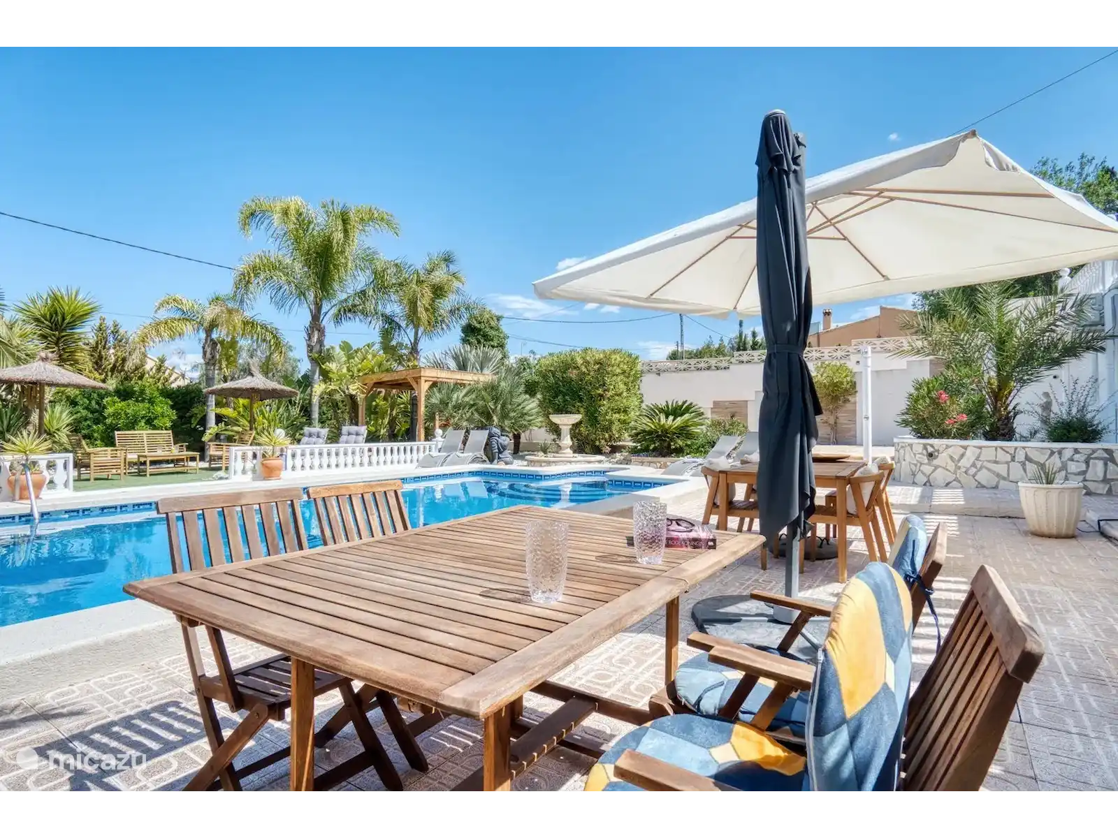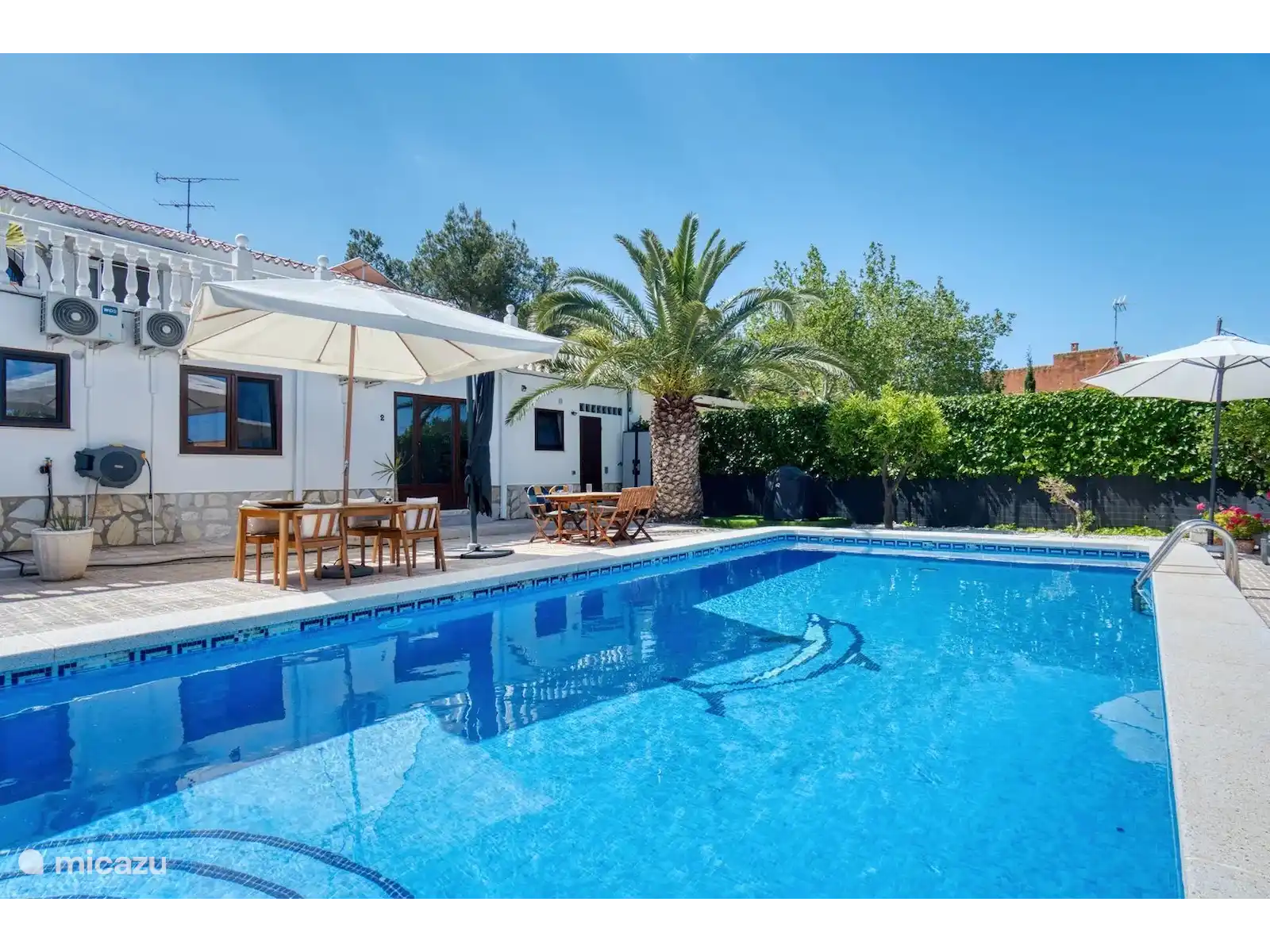 Les équipements supplémentaires comprennent un lave-vaisselle, un lave-linge, un sèche-linge, un sèche-cheveux et un barbecue. Un lit bébé et/ou une chaise haute sont disponibles sur demande. De l’appartement, il y a un accès direct au jardin, à la table à manger et à la piscine avec chaises longues. Dans le jardin, il y a un bar avec un grand réfrigérateur, des toilettes extérieures et une douche extérieure. Des serviettes de plage/piscine seront également fournies.