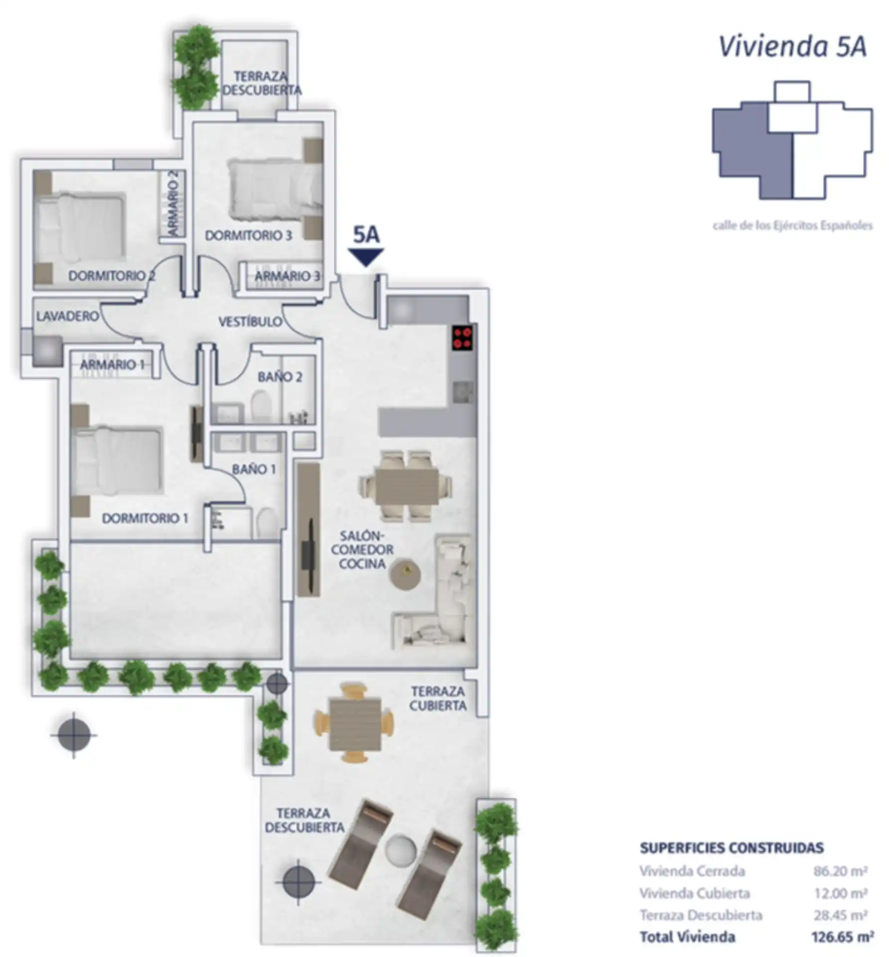 À l’intérieur, l’appartement dispose de trois chambres climatisées bien aménagées et de deux salles de bains modernes. La suite principale sert d’oasis de calme, avec un lit double confortable, un grand espace de rangement, une télévision intelligente et une vue imprenable sur la mer. La salle de bain attenante dispose de deux lavabos, d’une douche luxueuse et de toilettes. Les deuxième et troisième chambres ont toutes deux deux deux des lits simples et un espace de rangement. Une salle de bains séparée plus loin dans le couloir offre plus de commodité, avec une douche, un lavabo et des toilettes. Pour plus de commodité, il y a aussi une buanderie avec une machine à laver.