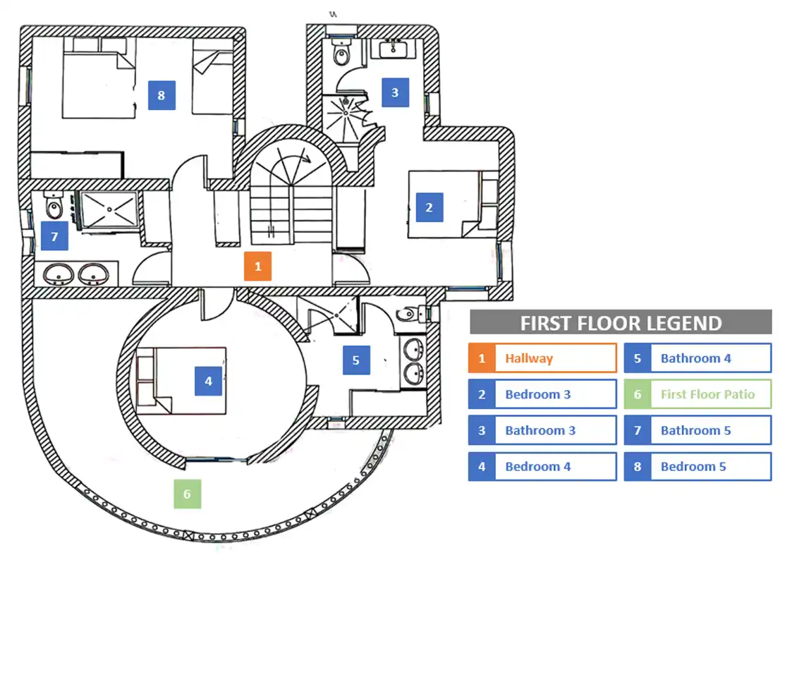 À cet étage, vous trouverez les deux premières chambres avec climatisation. Une chambre dispose d’un lit double et l’autre de lits jumeaux. Une chambre dispose d’une salle de bain attenante et l’autre a la salle de bain dans le couloir. La salle de bains privative dispose d’une douche, d’un lavabo et de toilettes. Dans l’autre salle de bain, vous trouverez une combinaison baignoire/douche, un lavabo et des toilettes.