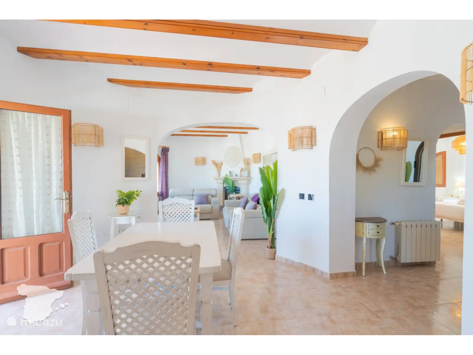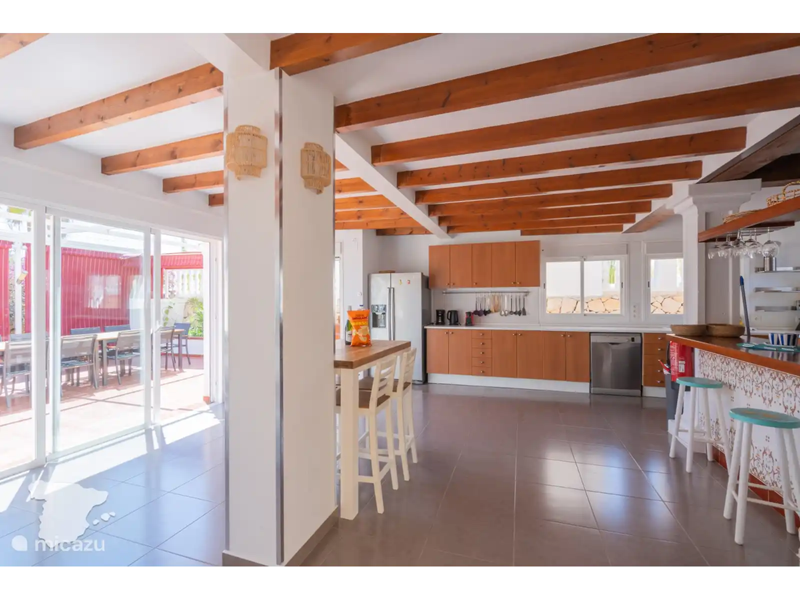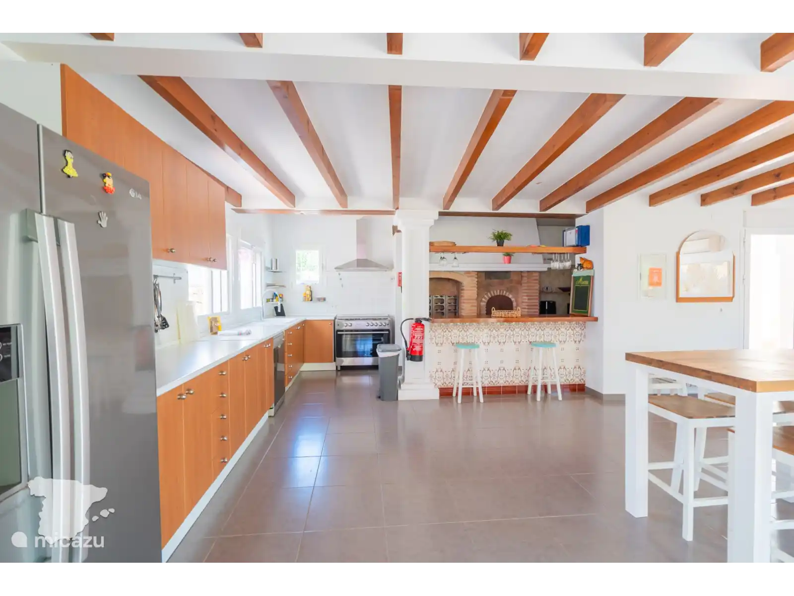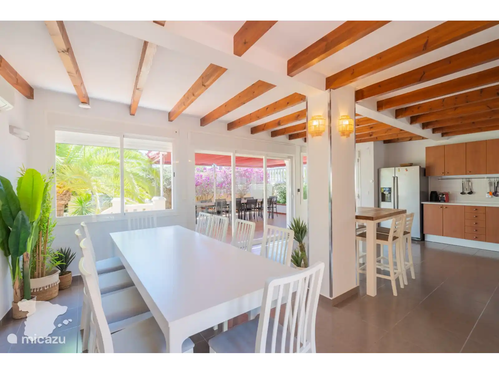 Lorsque vous entrez dans la Villa Margarita, vous verrez le salon avec la télévision sur le mur et les sièges autour, il y a donc beaucoup d’espace pour se détendre et regarder vos émissions préférées après une journée à la plage. Tenez facilement le front intérieur informé via le WIFI gratuit (fibre optique). De là, jetez un coup d’œil à la table à manger. Des dîners de famille tous les jours ! De plus, la grande cuisine avec tous les appareils importants et de nombreux placards. Il est prêt pour que vous puissiez préparer les repas de famille quand vous le souhaitez.