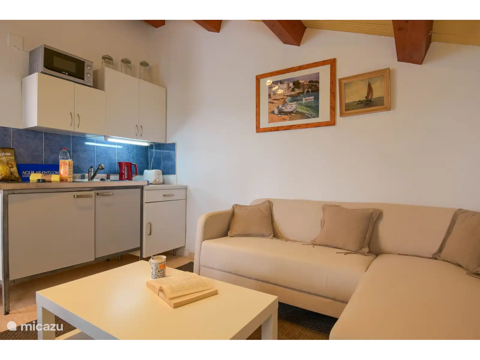 - Cuisine-séjour avec cuisinière électrique, four électrique, micro-ondes, réfrigérateur-congélateur, cafetière, bouilloire, mixeur, grille-pain et presse-agrumes