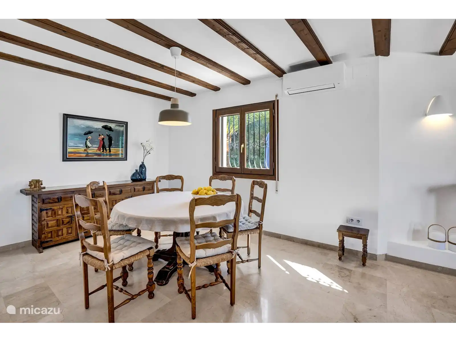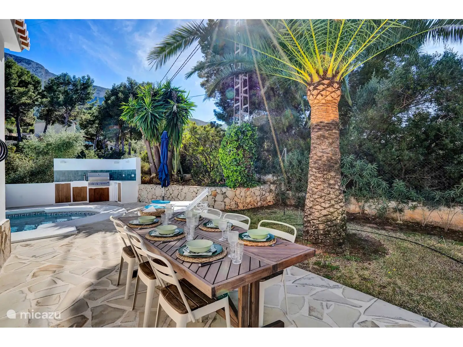 Devant la villa se trouve un magnifique porche couvert offrant de superbes vues sur la mer, le port et la ville de Dénia. Il est équipé d’une grande table à manger (extensible) avec des chaises. Ici, vous pouvez vous asseoir et vous repenser jusqu’à tard dans la nuit.
